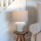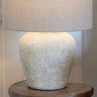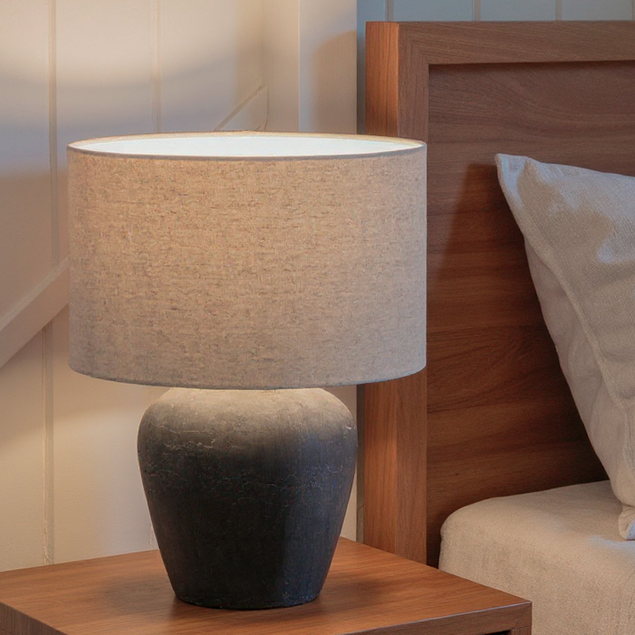 "Suitable as a bedside lamp or for a lounge this textured stone based lamp is finished with a taupe coloured linen shade. The use of materials lends itself to a wide choice of interiors" - Jessica and Adam