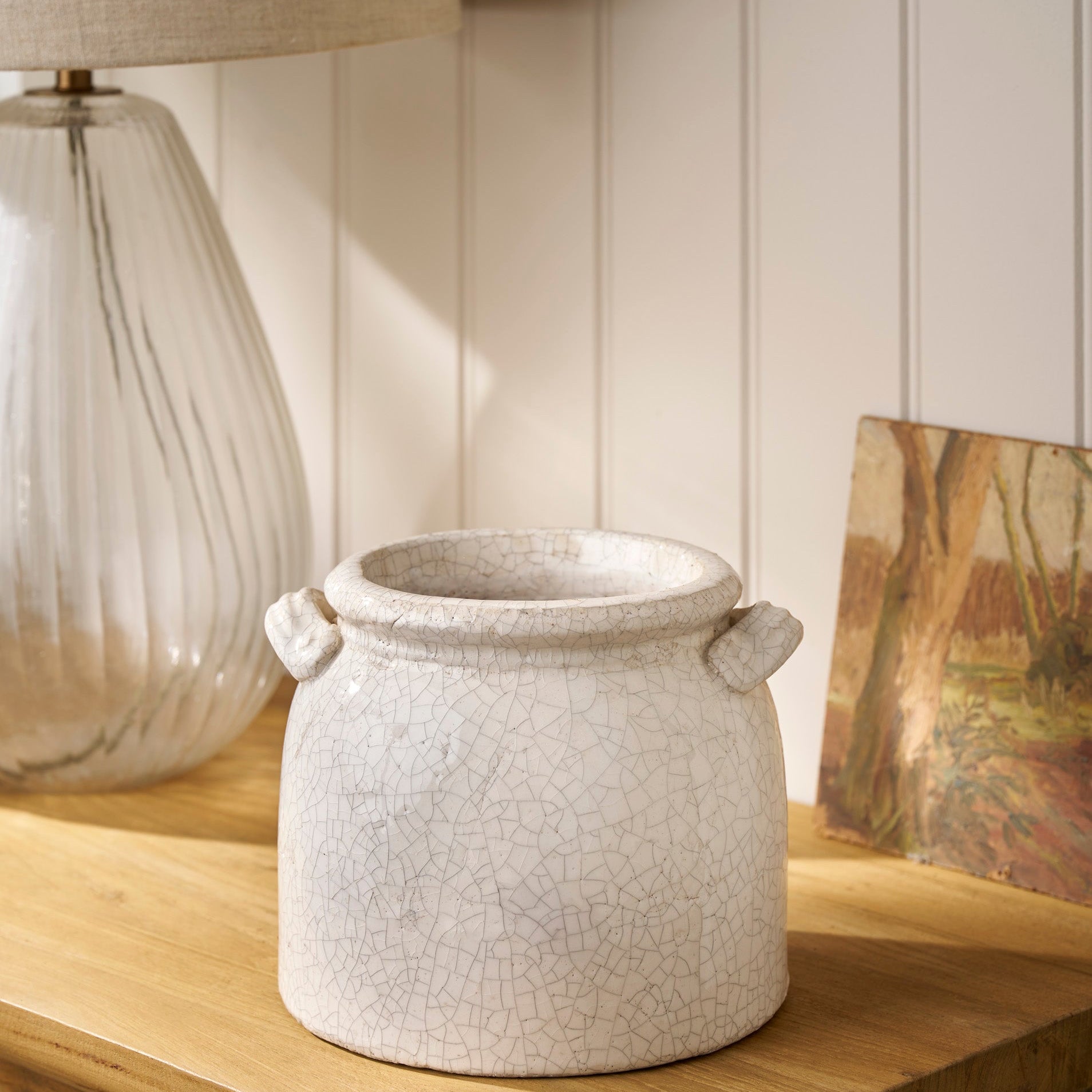 "Handcrafted with a crackle white glaze this Ravello Pot with Handles is multi-functional for use around the house. The chunky rounded shape has two small handles leading to a rolled neck giving it a classical feel" - Jessica and Adam