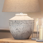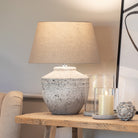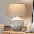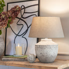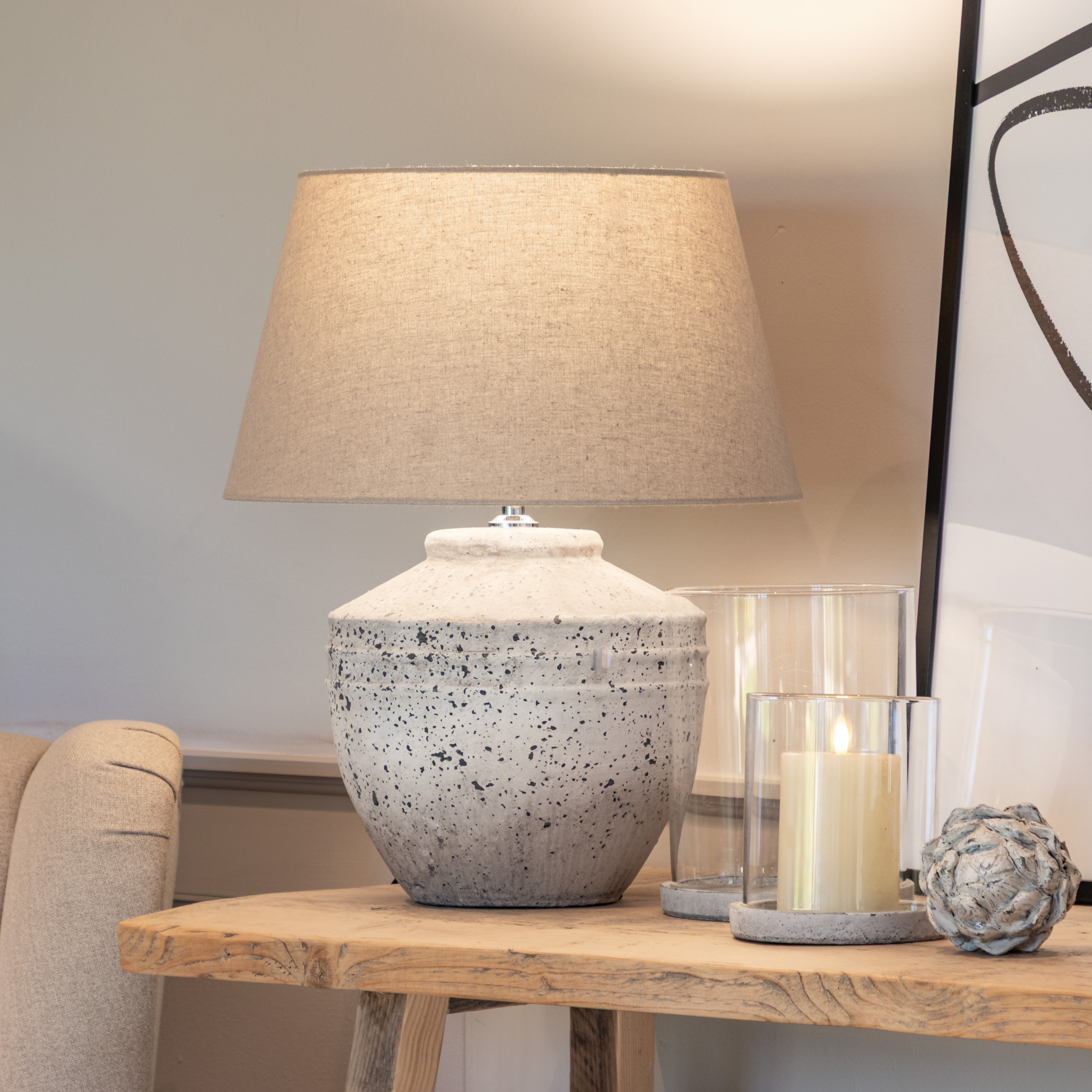 "A beautiful sculpted stone based lamp base finished with a natural linen taupe coloured shade. The use of materials lend themselves to a range of interior styles" - Jessica and Adam