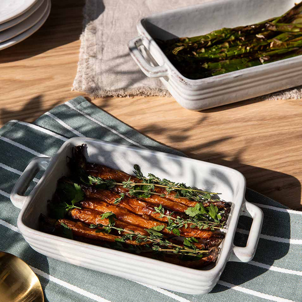 "Cook up a storm in our Damerham Oven Dish. This set of two, featuring little and large oven dishes is ideal for roasting vegetables, potatoes and meat and each one has handles either side to make it easy to get in and out of the oven. To allow for easy storage they nestle inside one another, and pair perfectly with other Grey ovenware from our Damerham range" - Jessica and Adam