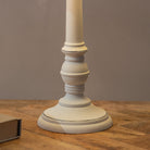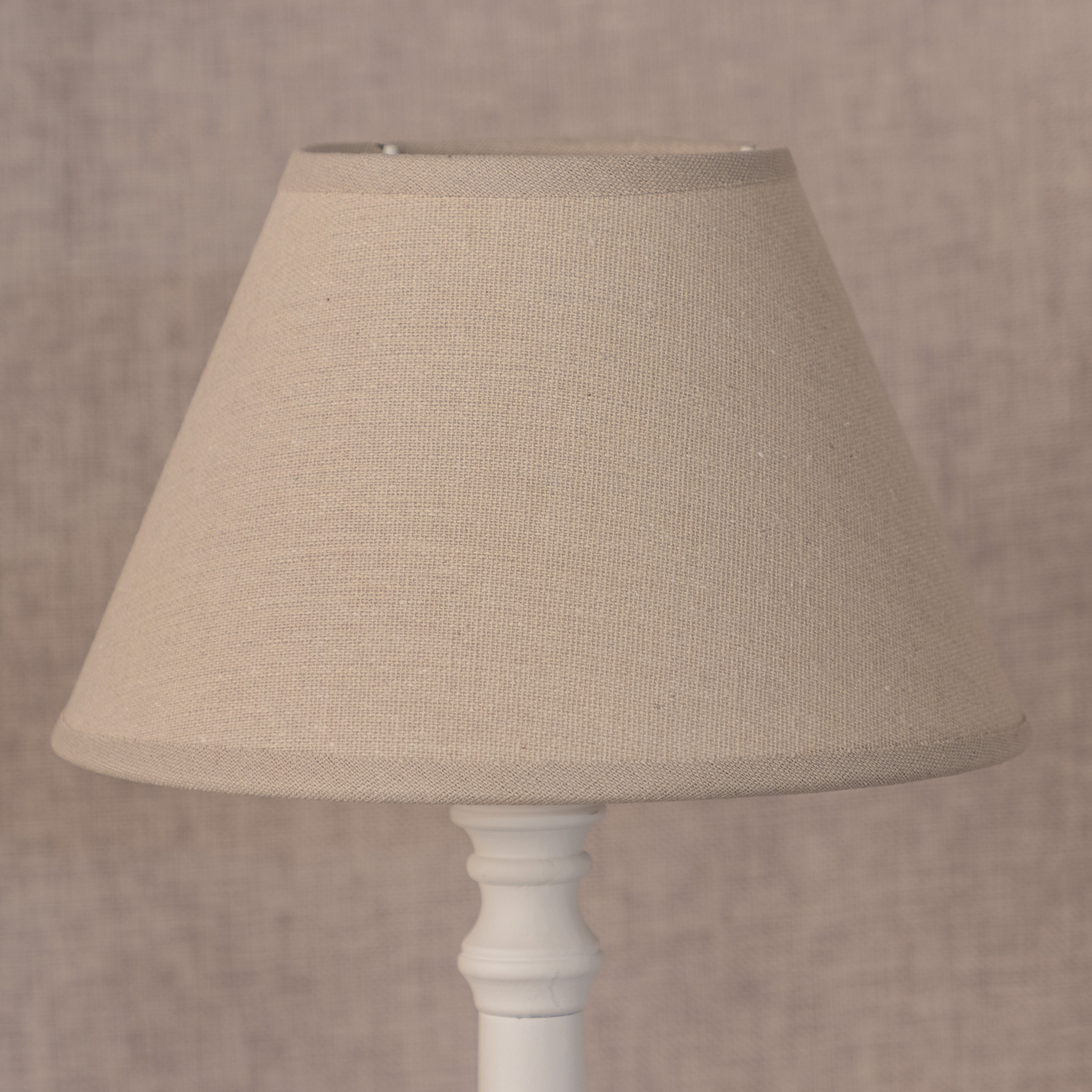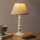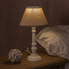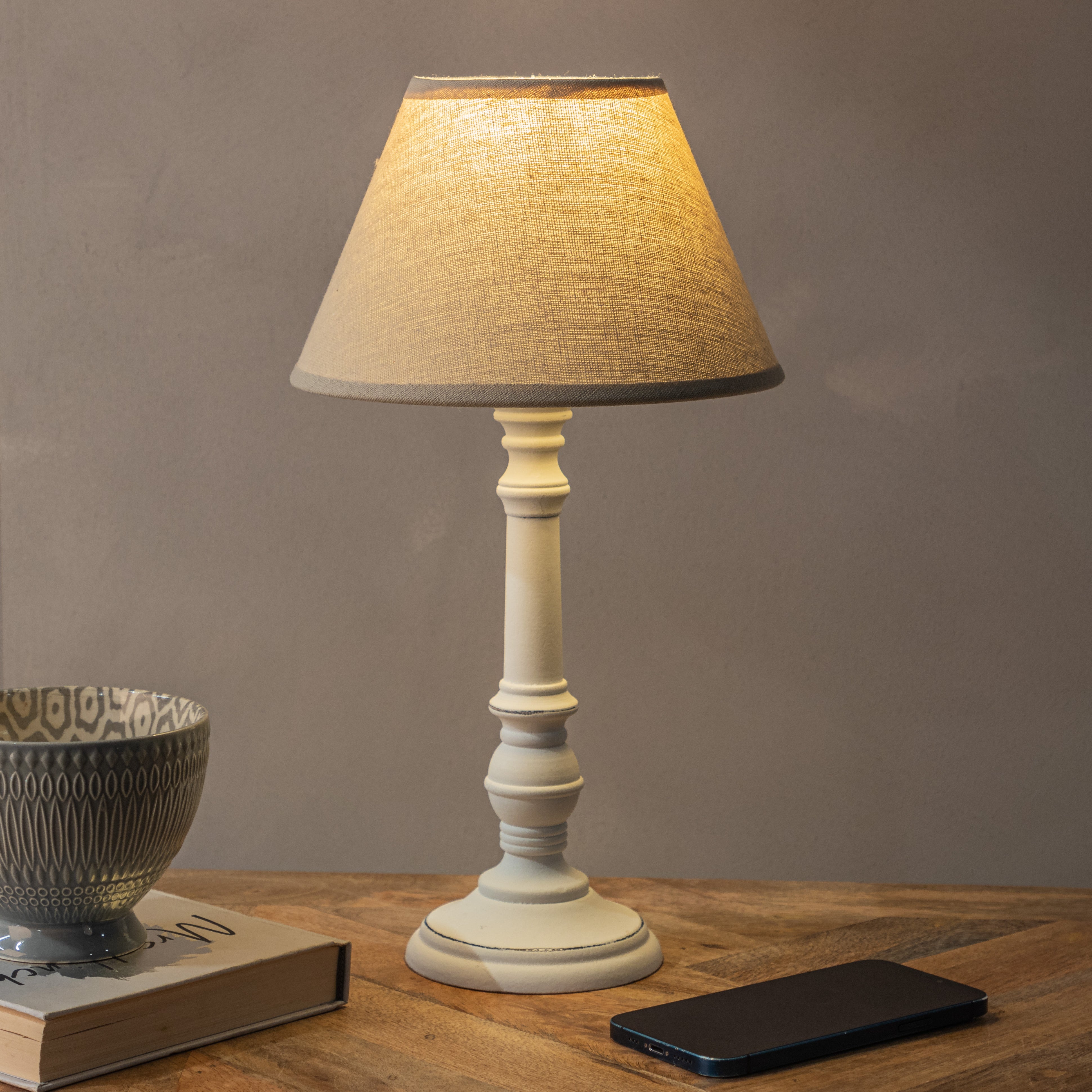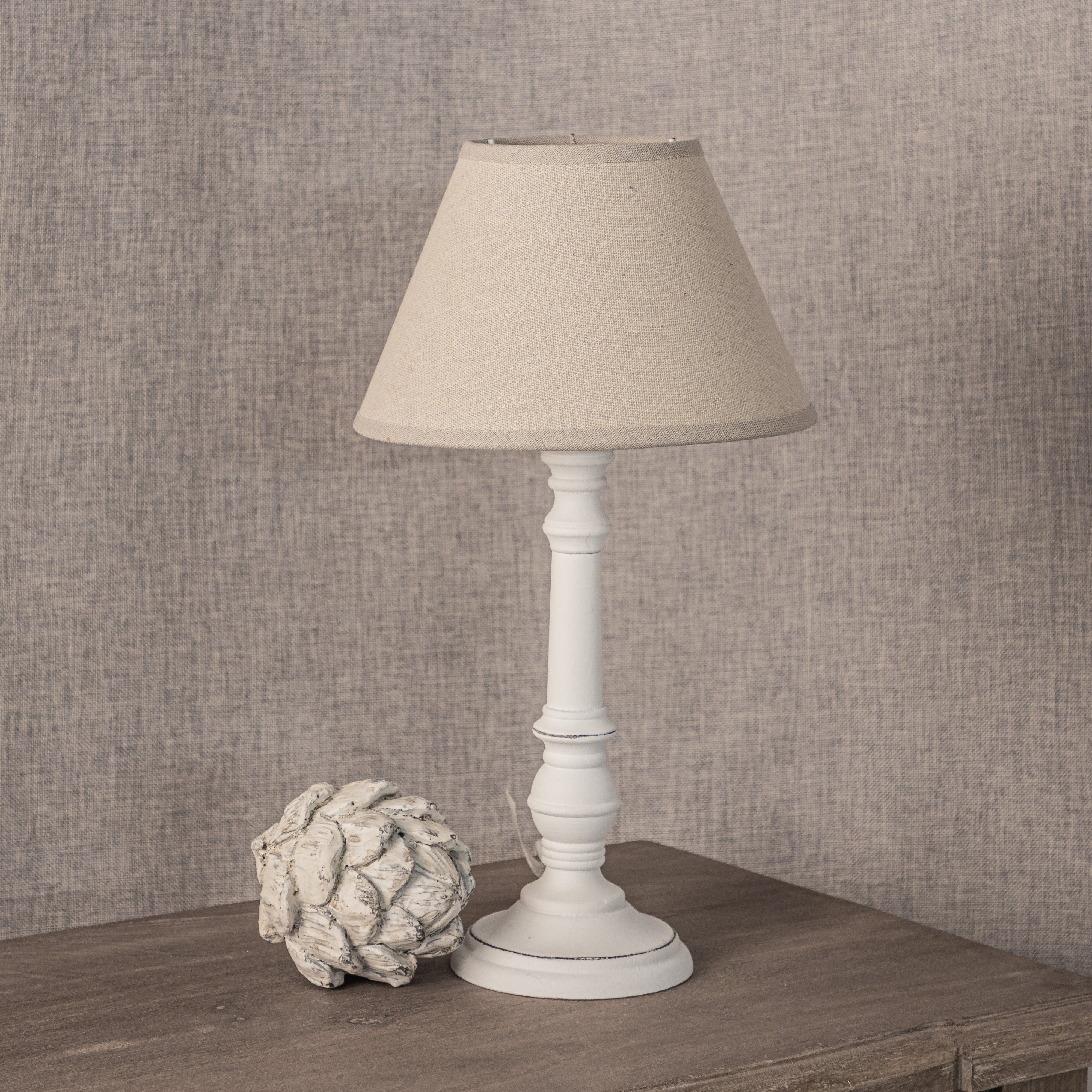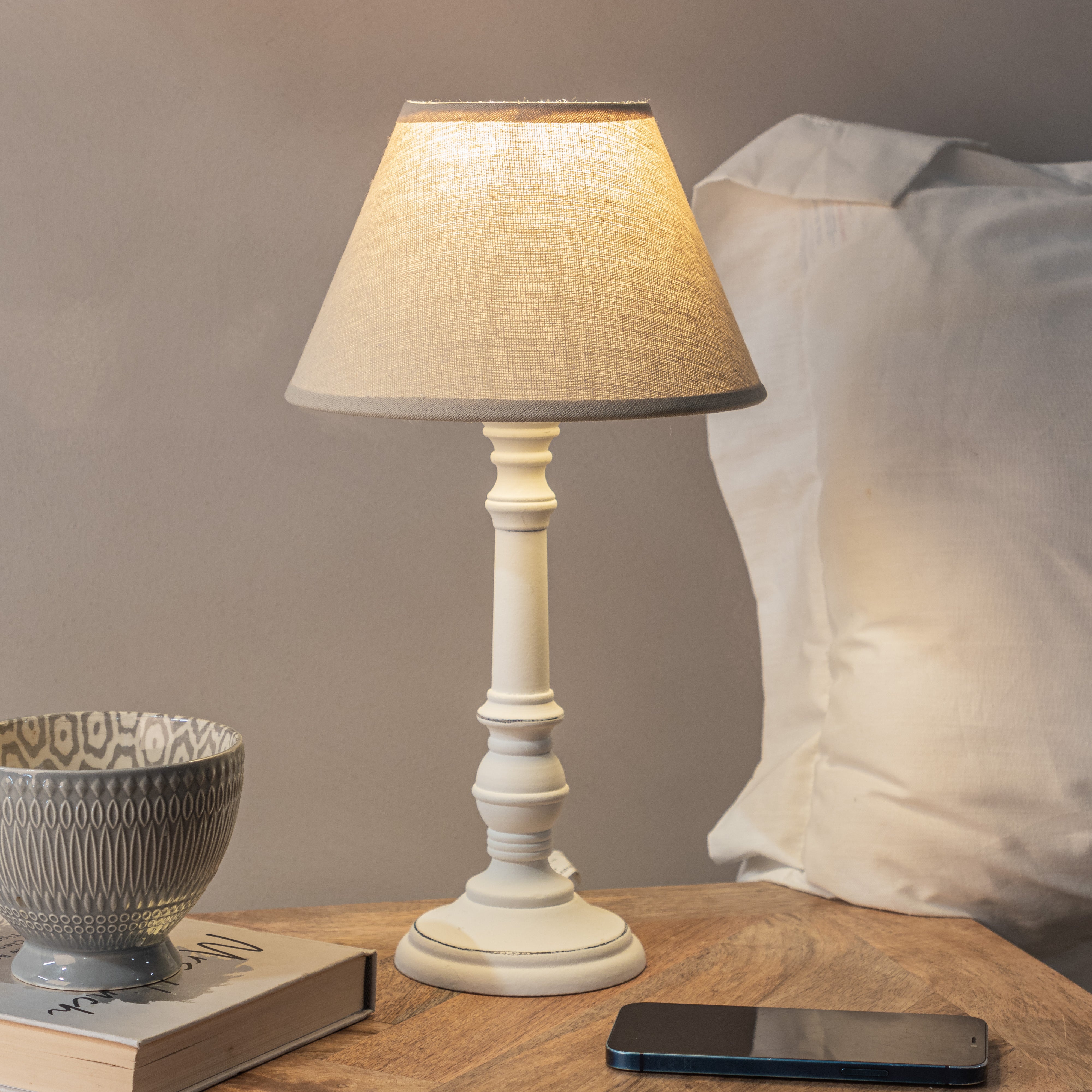 "This fabulous new white version of our very popular country cottage style lamp is the perfect complement for bedside or side style tables. Featuring a slender turned wooden base with a shabby chic style washed wood finish and fabric shade. This pretty lamp is full of rustic charm and shabby chic design and is ideal for lighting small alcoves and tables. The lamp comes with a practical inline light switch for ease of use" - Jessica and Adam