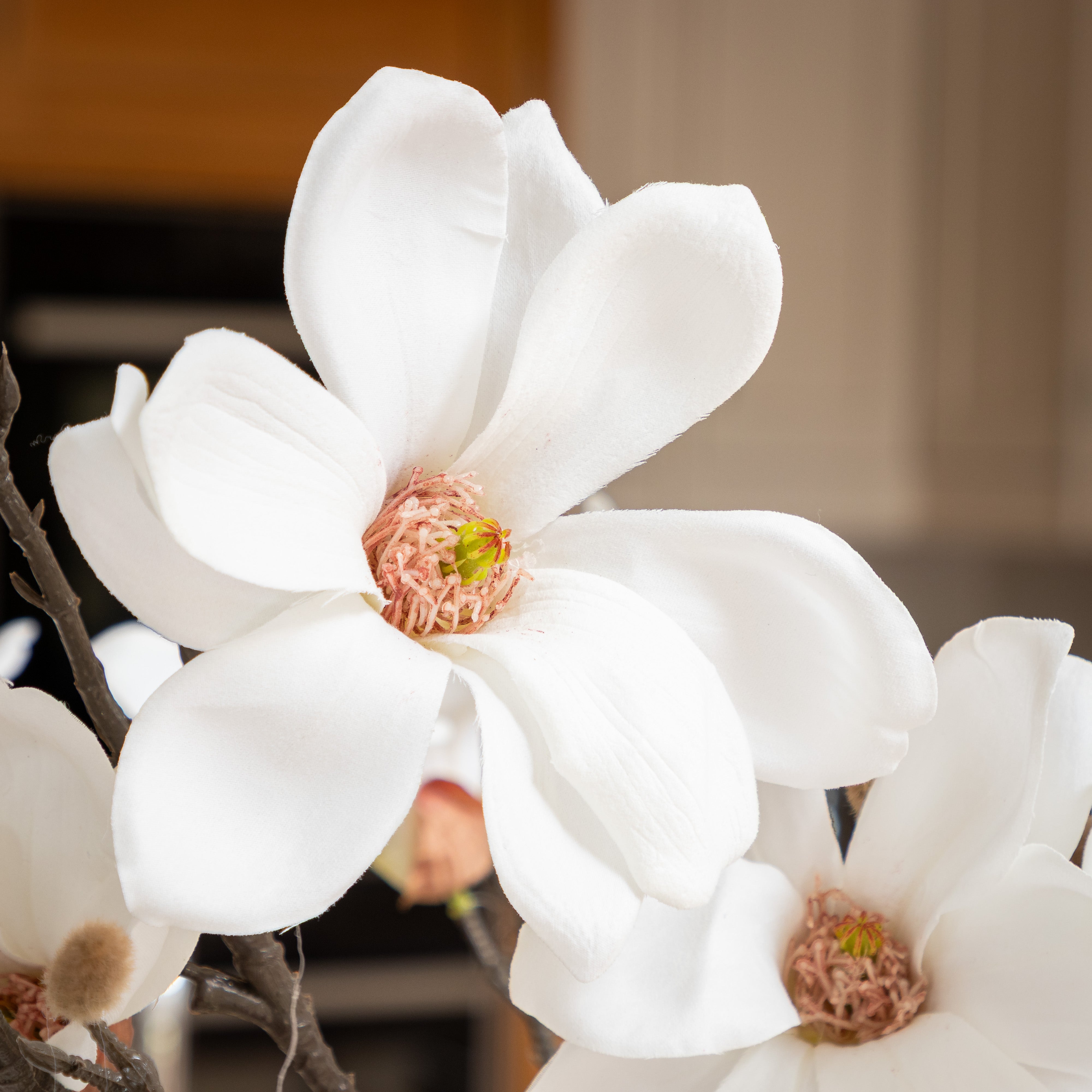 "This White Magnolia Branch Arrangement brings a touch of natural elegance to any space. Featuring graceful white magnolia blossoms, it adds serene beauty without the need for maintenance. Perfect for brightening up your home or office with a timeless, fresh look" - Jessica and Adam