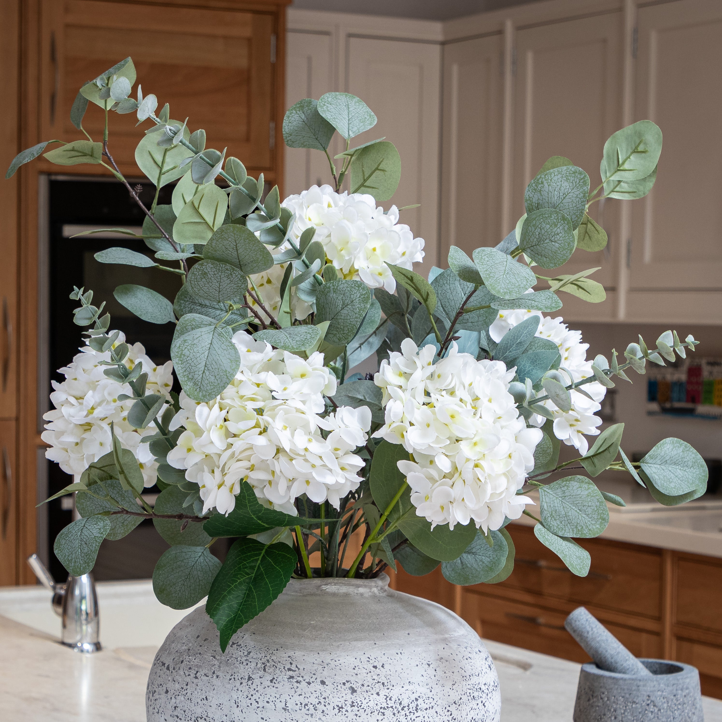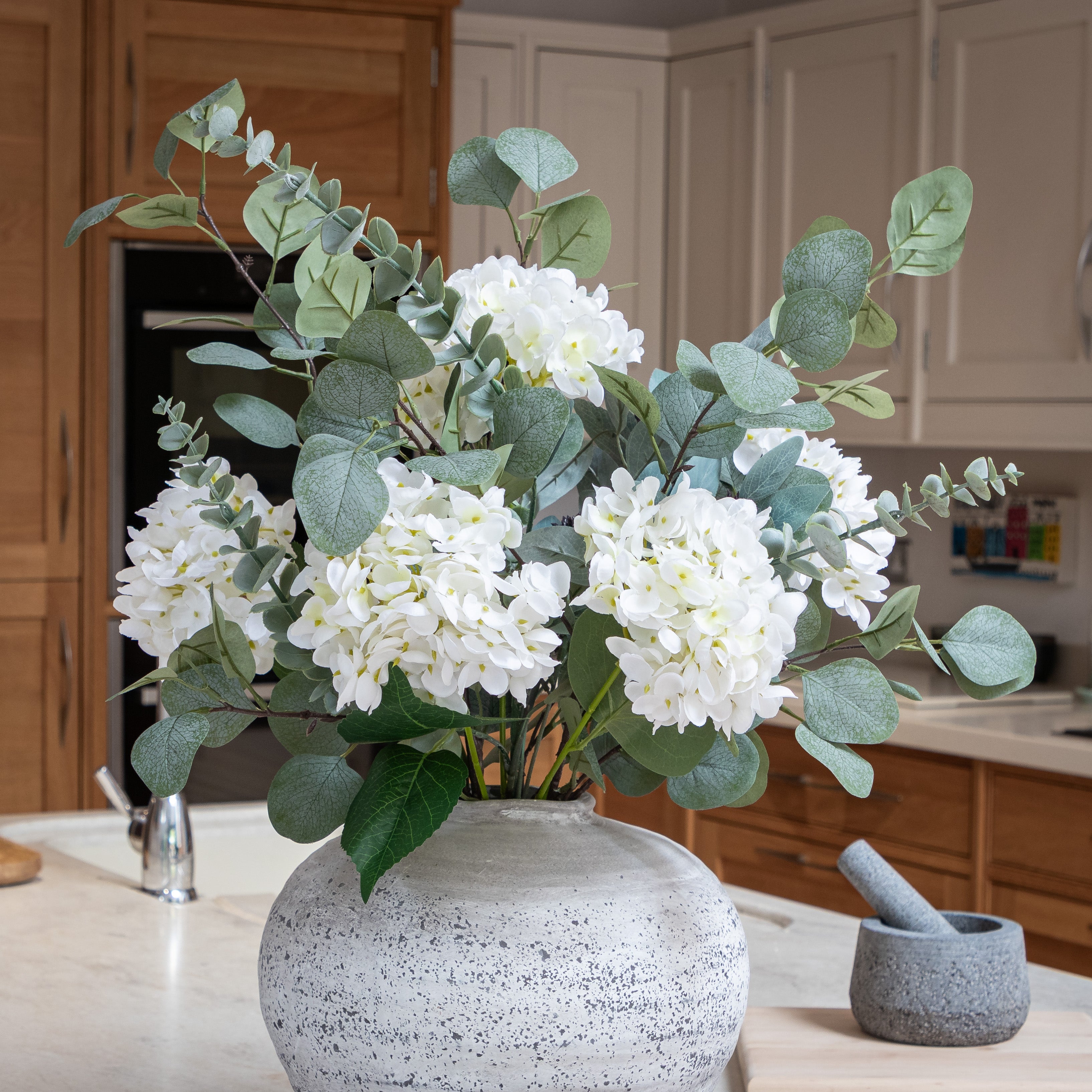 "Bring timeless beauty to any space with this Classic White Hydrangea and Eucalyptus Arrangement. Featuring soft white hydrangea blooms paired... See Description