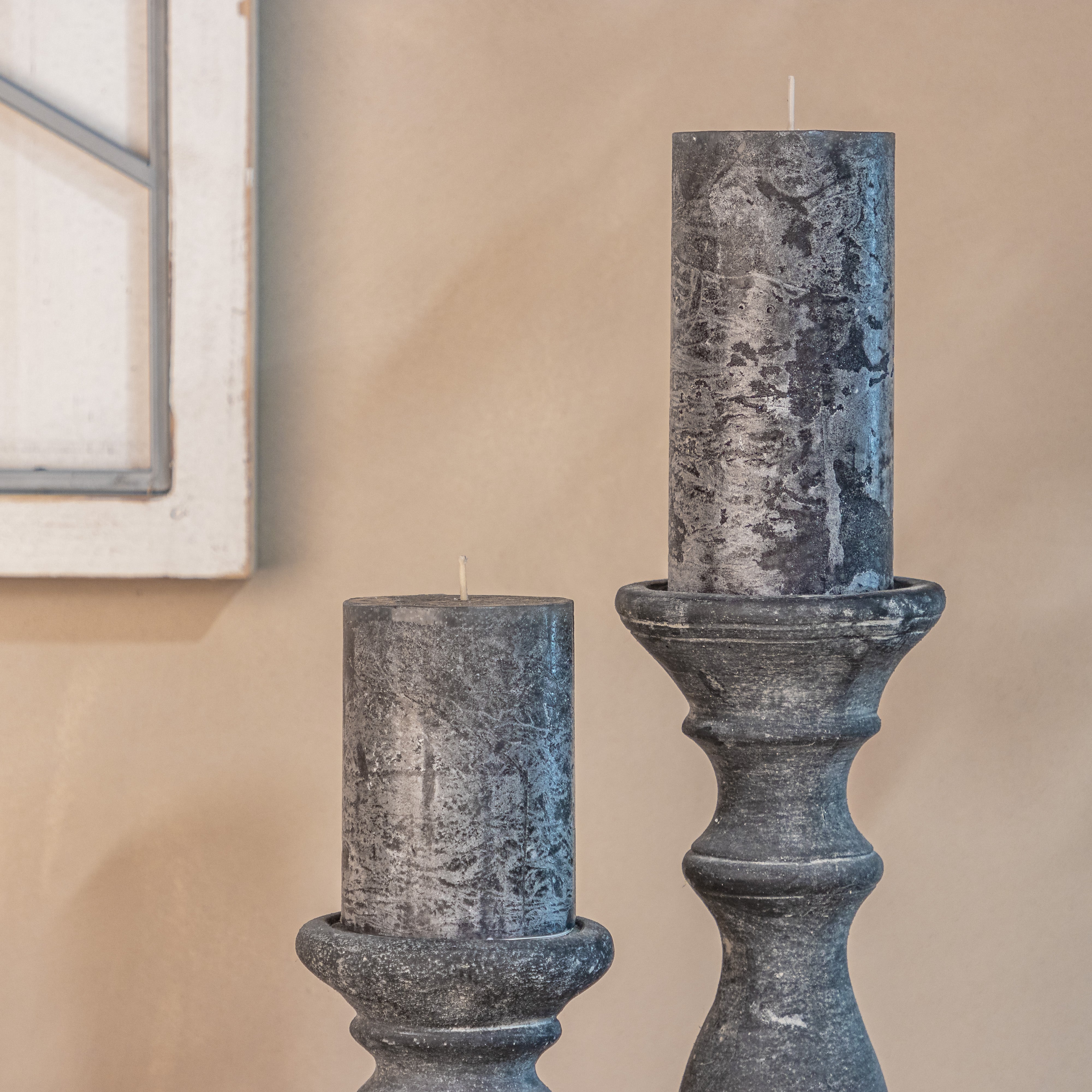 "Classic pillar candle in a contemporary slate colour, perfect addition to a candlestick or lantern. Burn time of approximately 35 hours" - Jessica and Adam