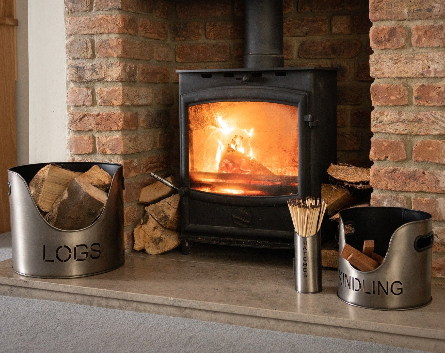"We chose this beautiful Log Bucket, Kindling Bucket and Giant Matchstick Holder Set in this aged pewter style as it perfectly matches many styles of fire and fire surrounds. The warm glow from the fire reflects on to the surface of the containers and looks amazing. It is also very practical as well so it keeps all larger logs and smaller wood kindling nicely contained and keeps the fireside hearth nice and clean. It's perfectly suited whether your room has a rustic older look or you are going for a more contemporary feel. Don't forget to check out our range of Companion Sets too to really make your fire the focus of your home this Winter" - Jessica and Adam