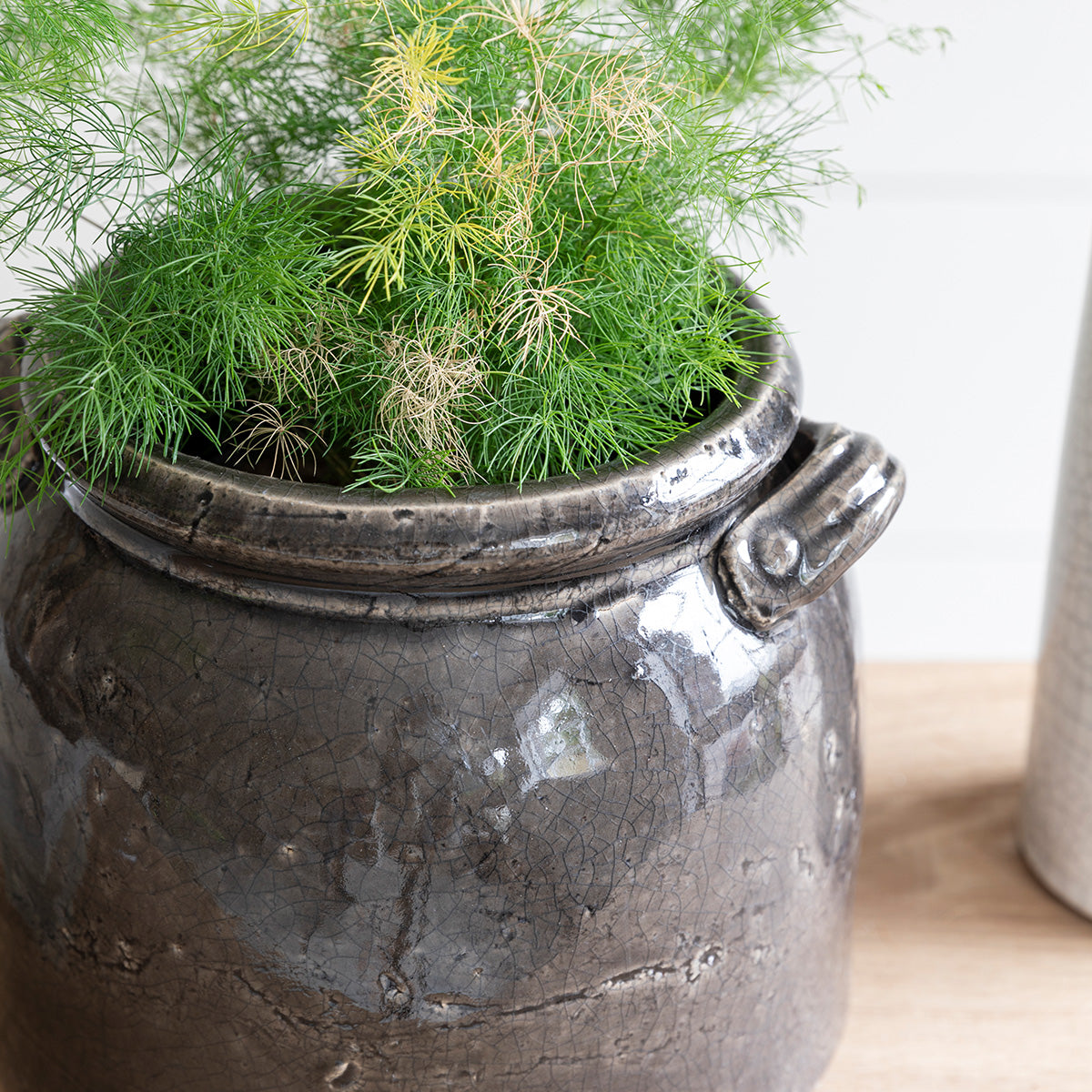 "Handcrafted with a crackle charcoal glaze this Ravello Pot with Handles is multi-functional for use around the house. The chunky rounded shape has two small handles leading to a rolled neck giving it a classical feel" - Jessica and Adam