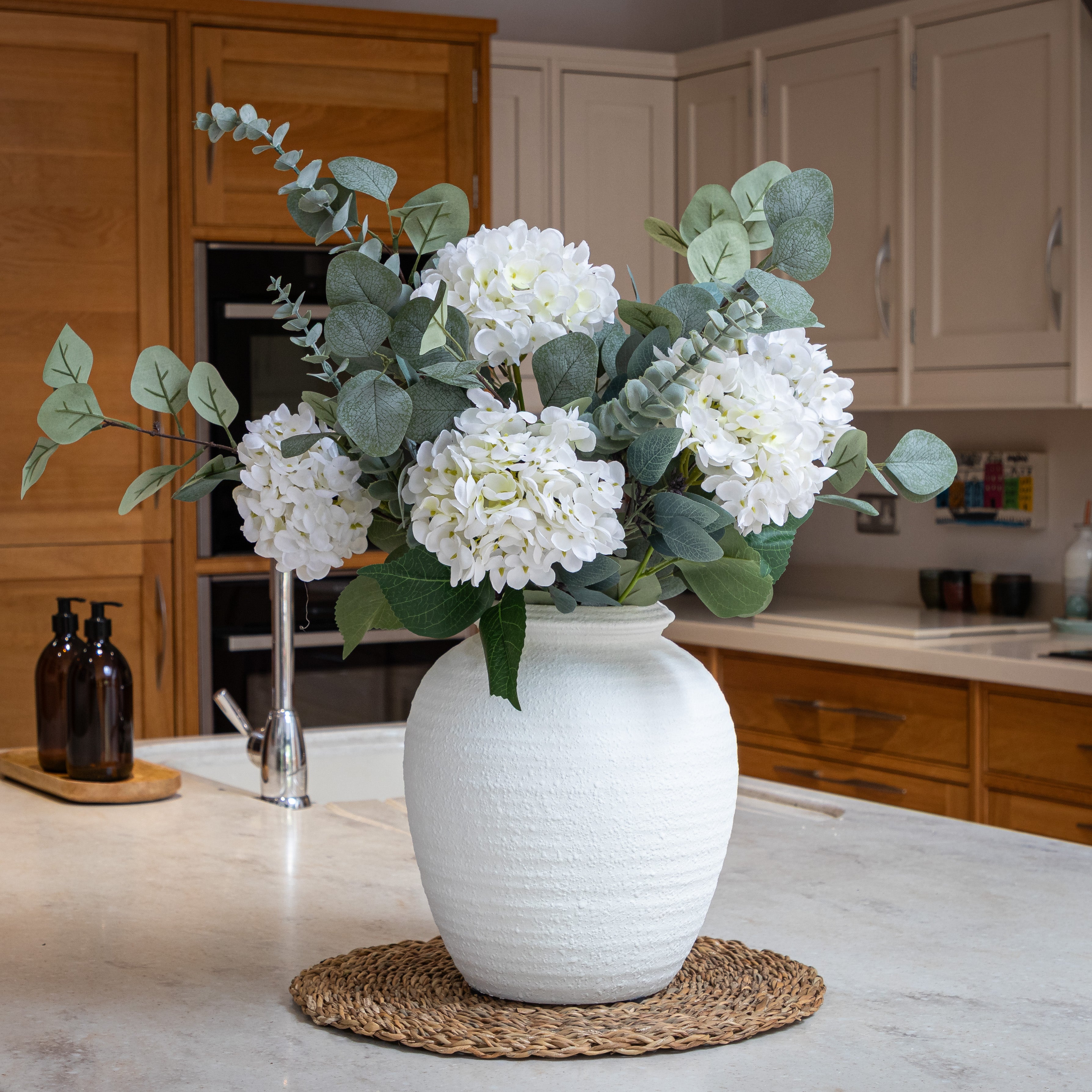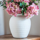 "This beautiful piece has a delicate textured ceramic finish in an elegant soft white colour. It's the perfect size to display our Faux Flowers or keep as a stand alone piece. A versatile vase in a truly classy timeless design." Jessica & Adam