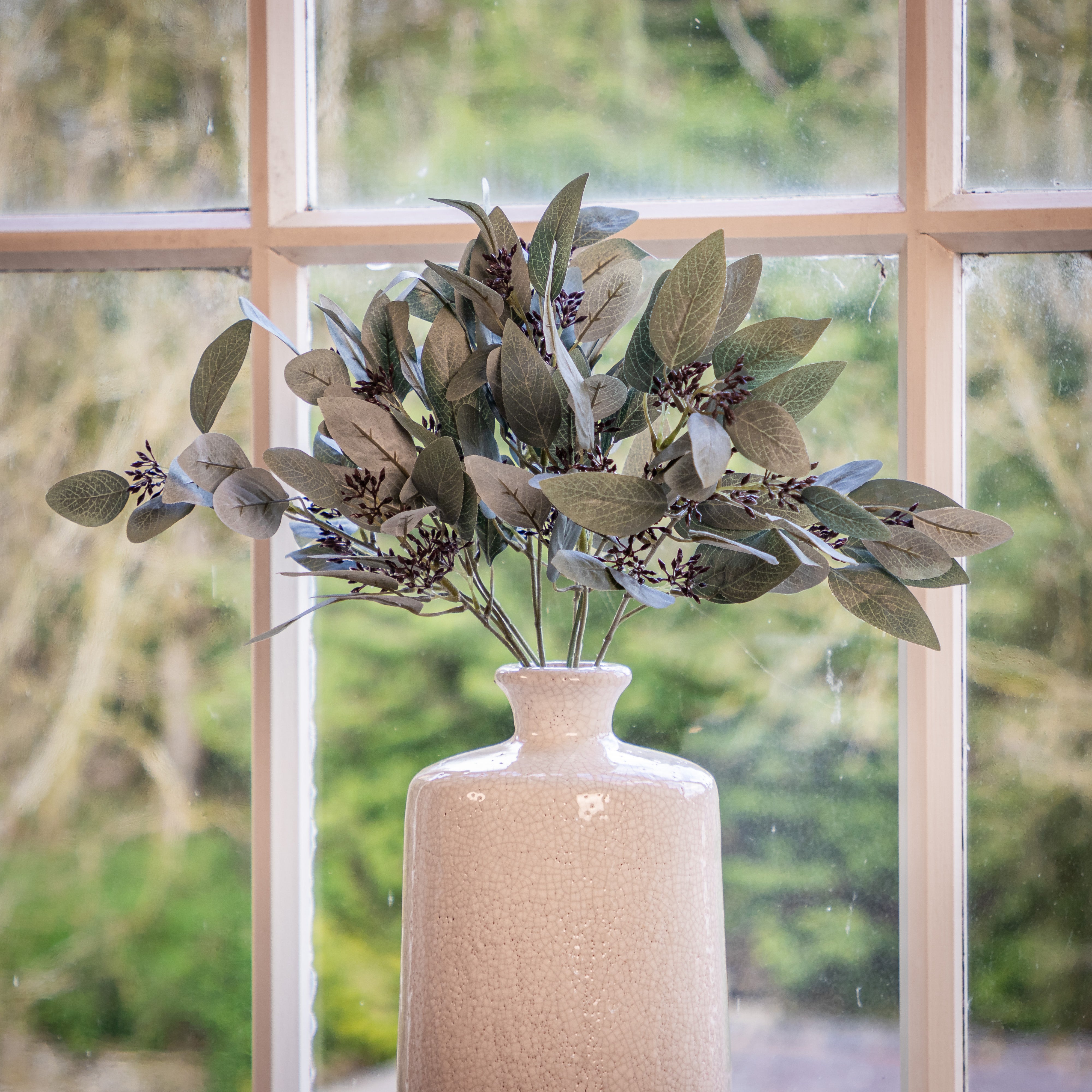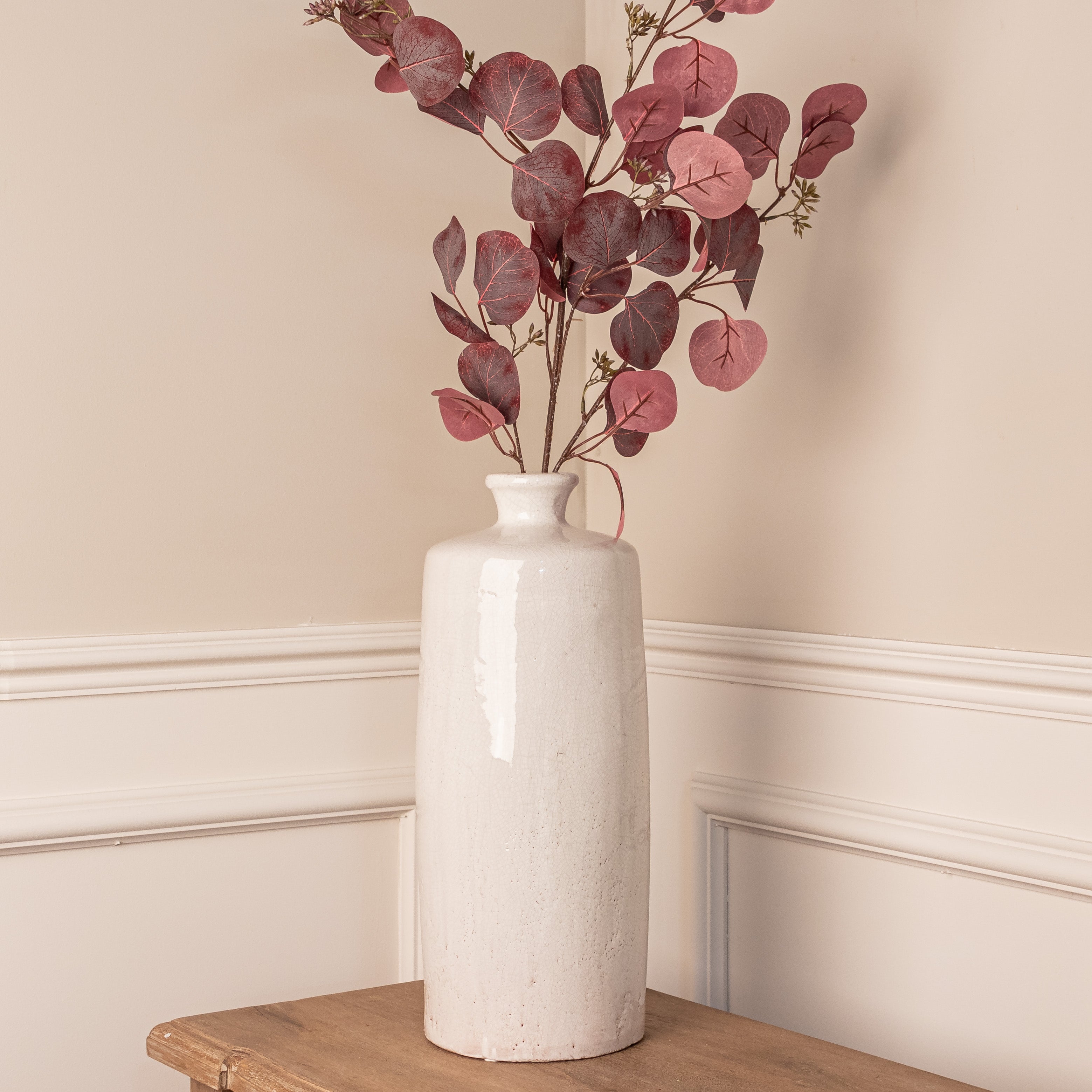 "This beautiful large white crackle glazed vase is the perfect vase to display tall floral displays with its narrow neck stems of pussy willow in winter, eucalyptus and even spring blossom keep your home looking fresh all ear round. The vase is designed for use with faux flowers only" - Jessica and Adam