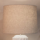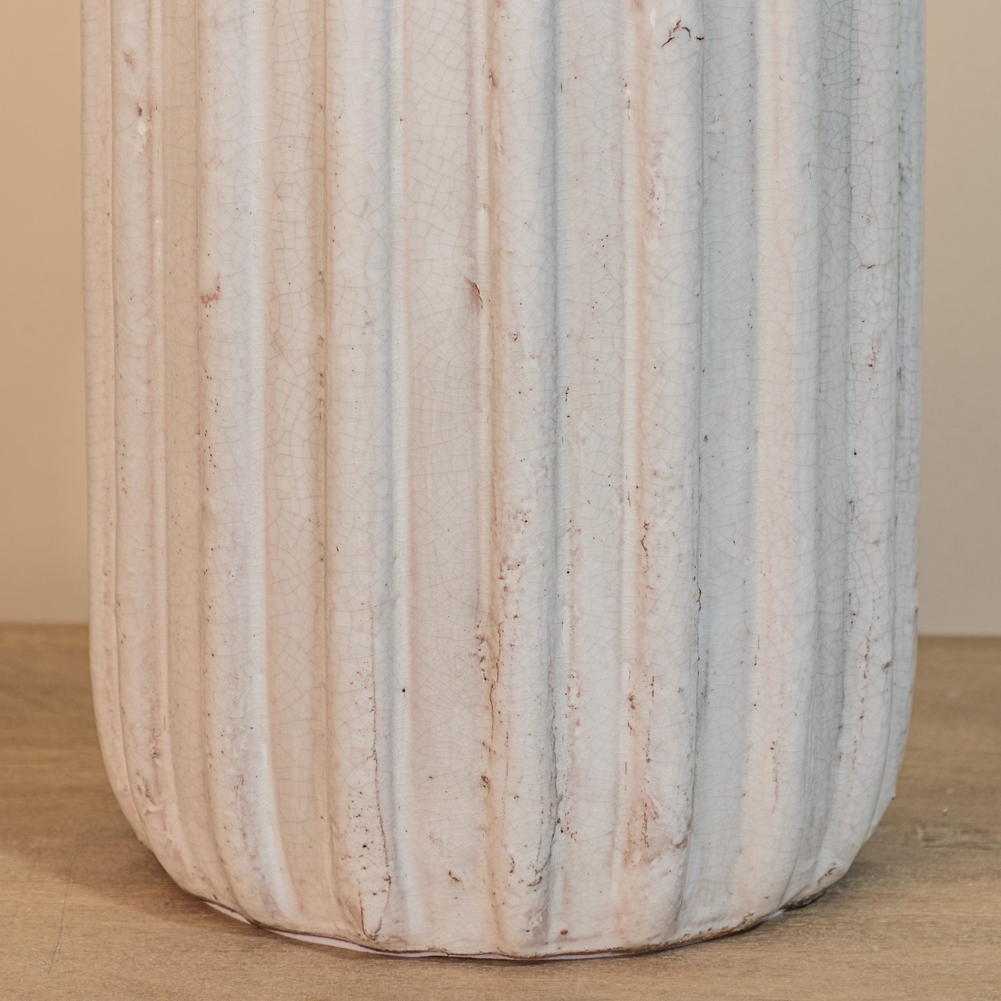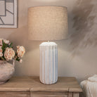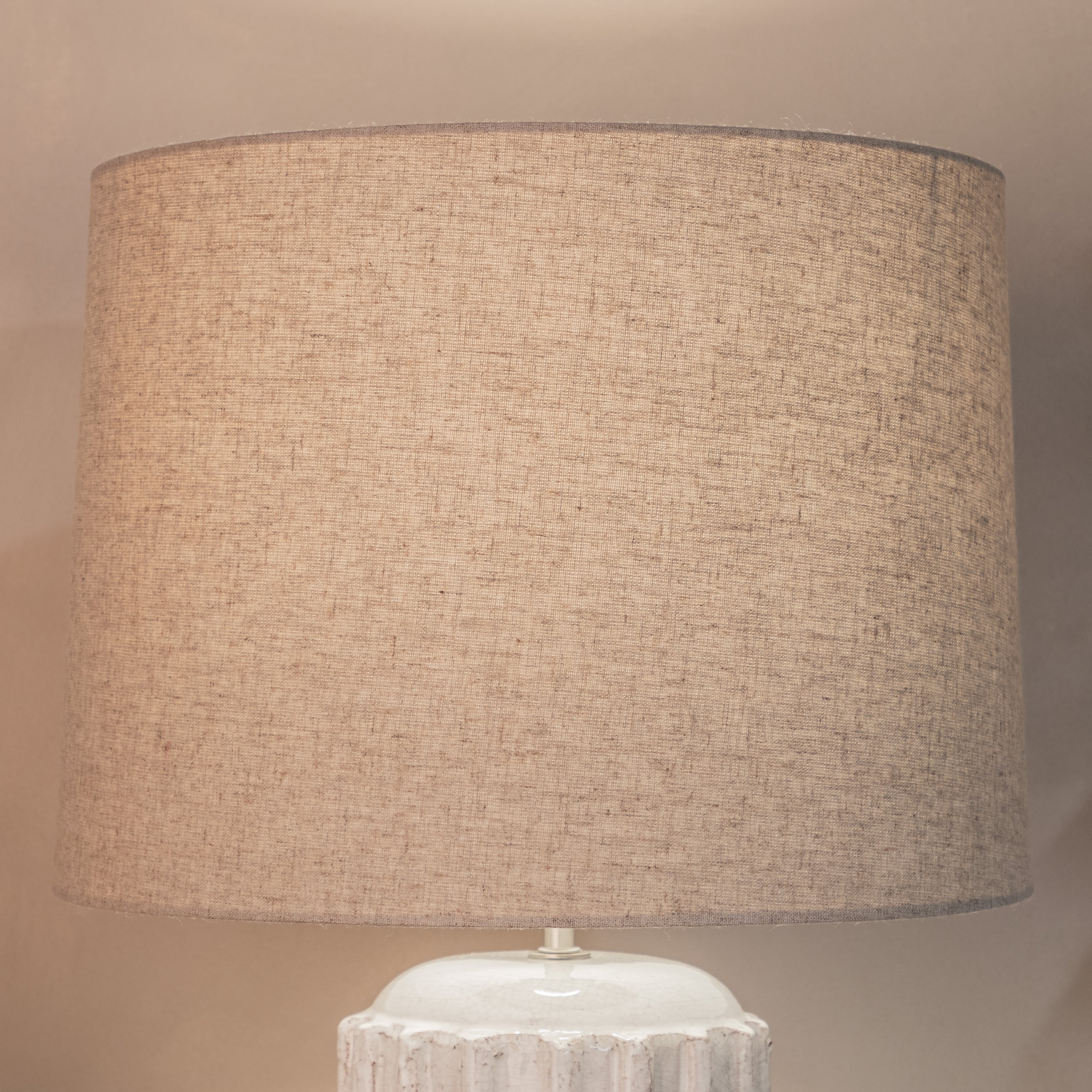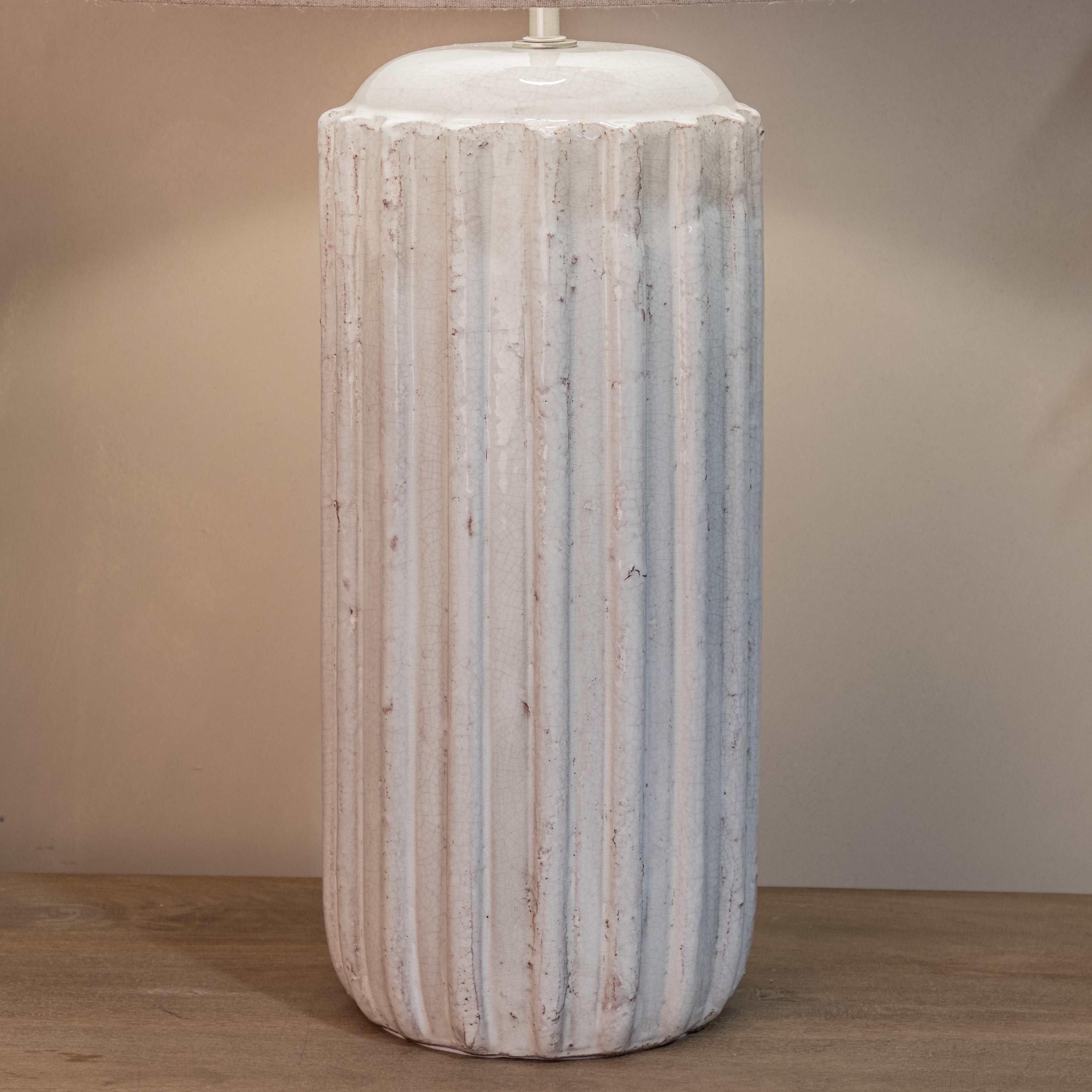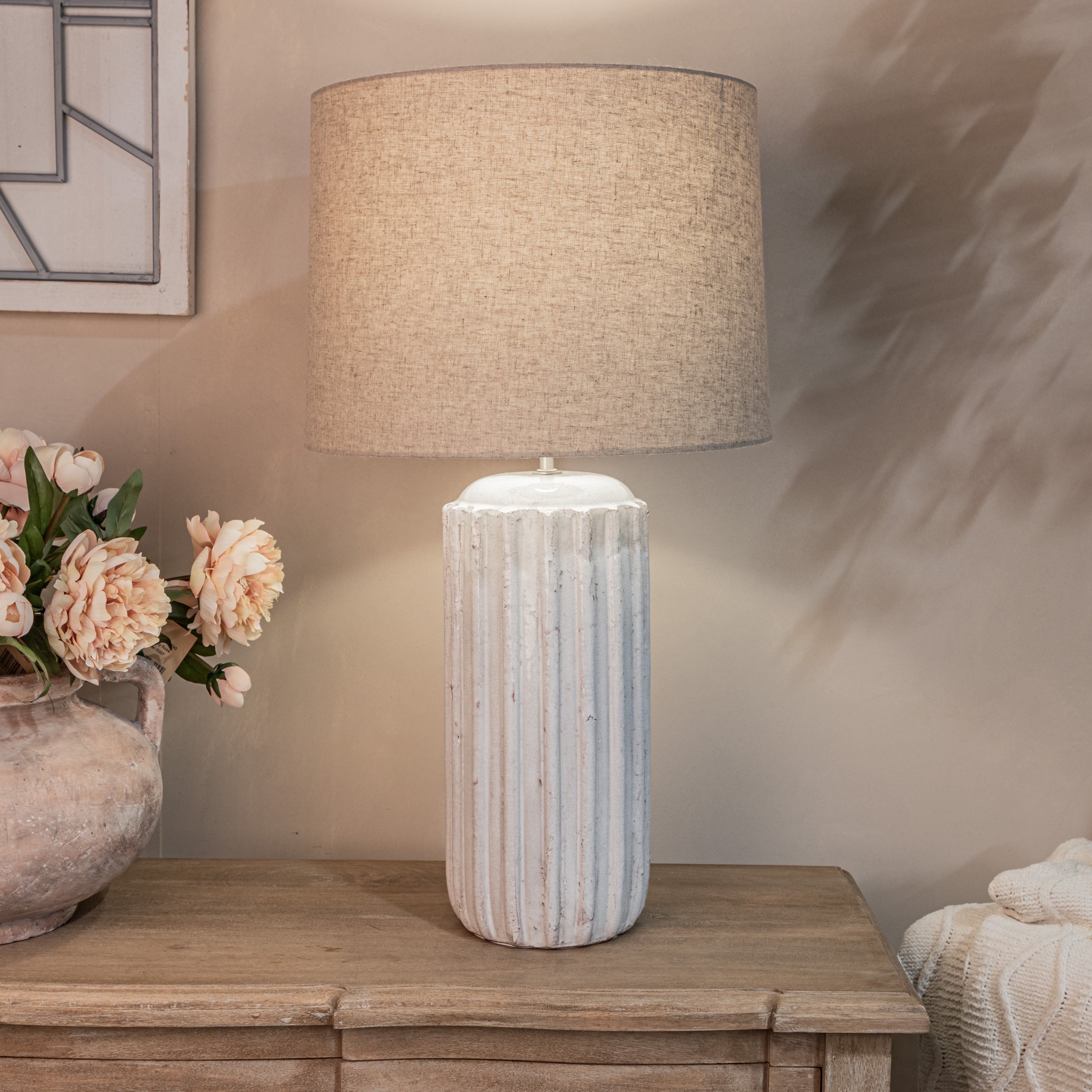 "Experience timeless elegance with our Tall Antique White Table Lamp. Its Ribbed Crackle Glazed base adds texture and sophistication to any room and it comes complete with this matching oatmeal coloured shade. The tall height allows for ample lighting making this lamp a practical and stylish addition to your home. Elevate your décor with this classic piece" - Jessica and Adam
