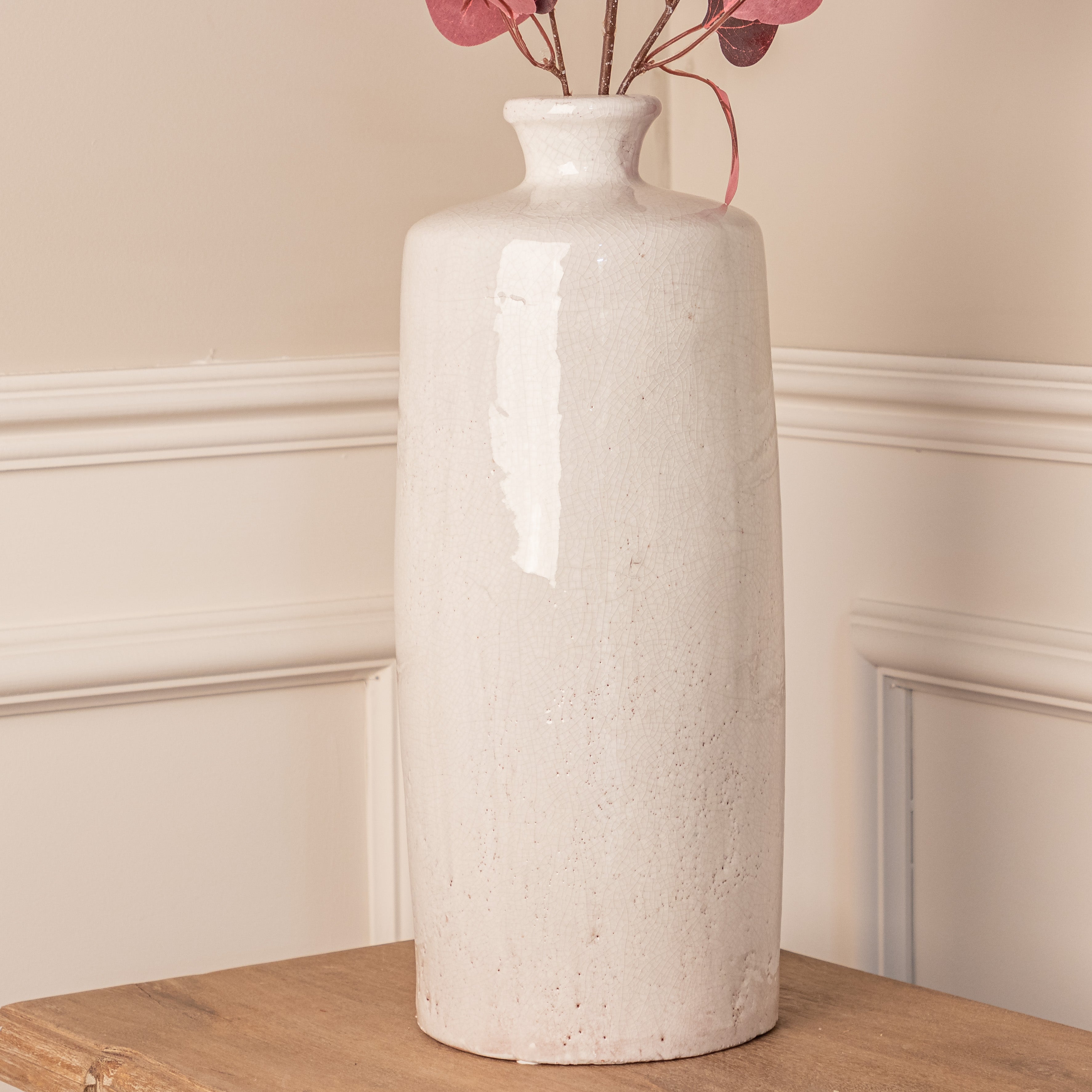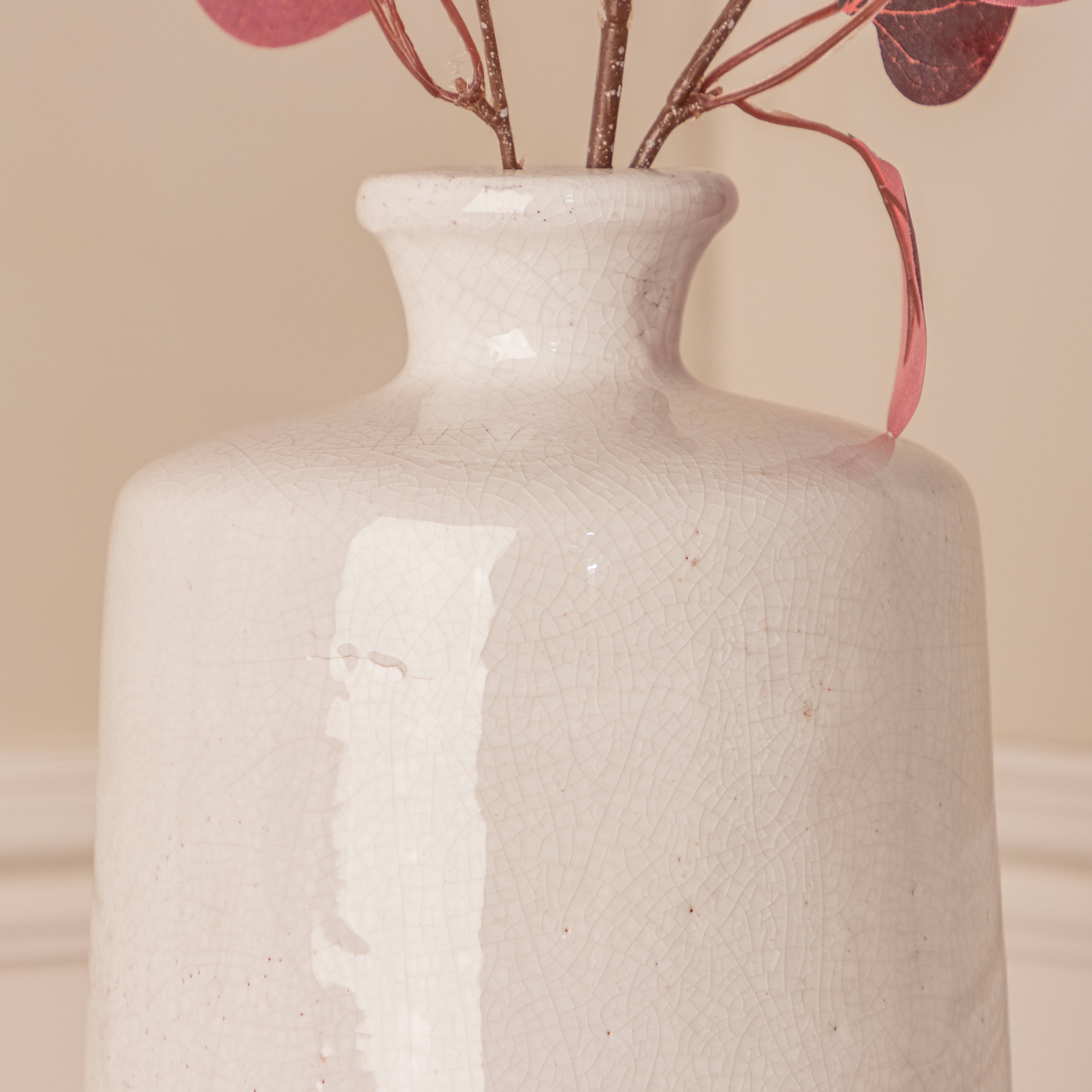 "This beautiful large white crackle glazed vase is the perfect vase to display tall floral displays with its narrow neck stems of pussy willow in winter, eucalyptus and even spring blossom keep your home looking fresh all ear round. The vase is designed for use with faux flowers only" - Jessica and Adam