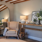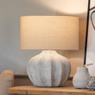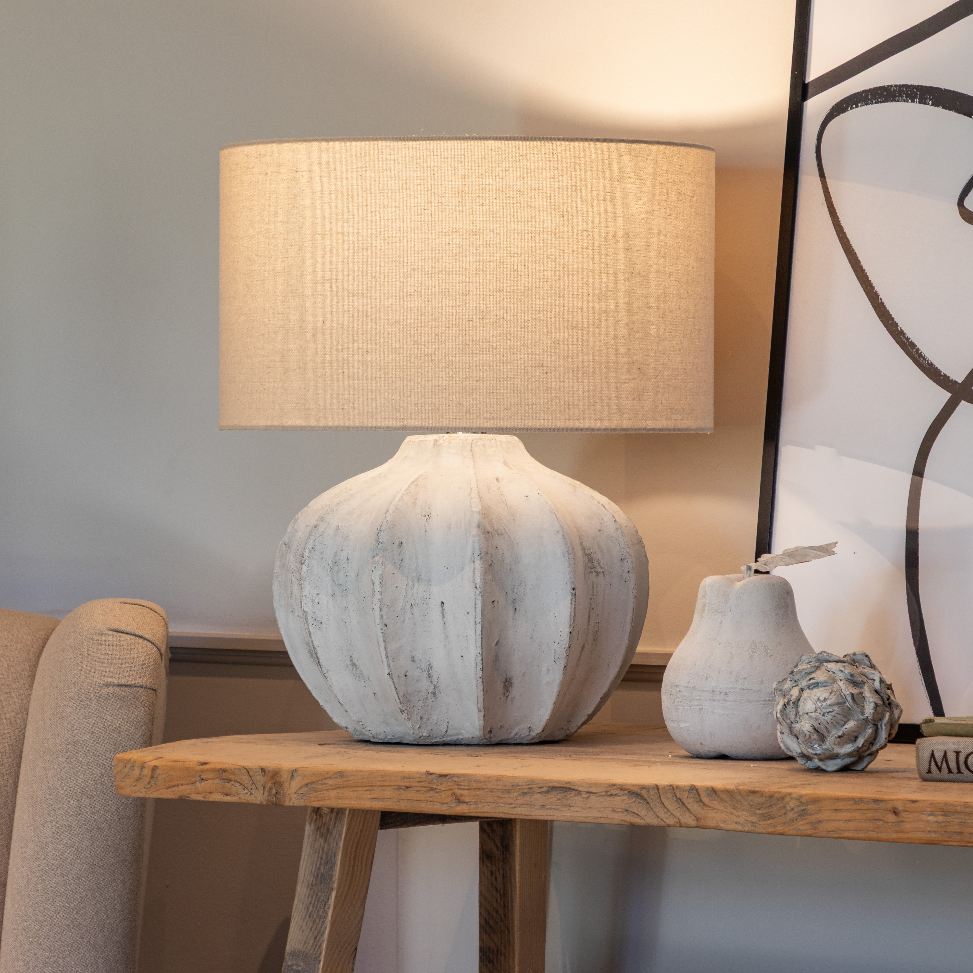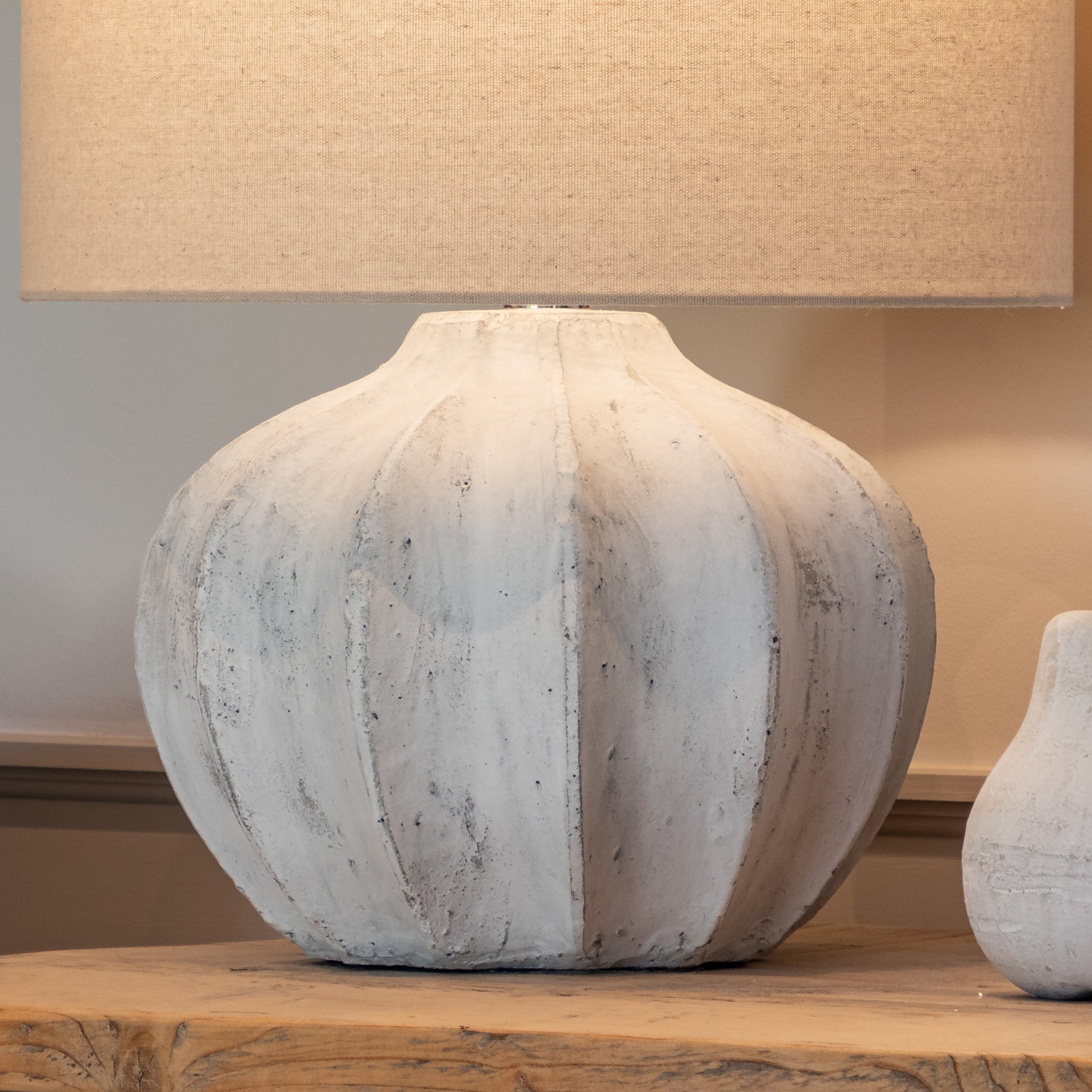 "Illuminate your space with this elegant Timeless White Stone Based Table Lamp with fluted sides. Crafted with a durable stone base, this timeless piece exudes a sense of sophistication with its rustic white finish. Perfect for any room, it adds a touch of class and functionality with its gentle lighting. Experience the beauty of simplicity with this stunning table lamp"- Jessica and Adam
