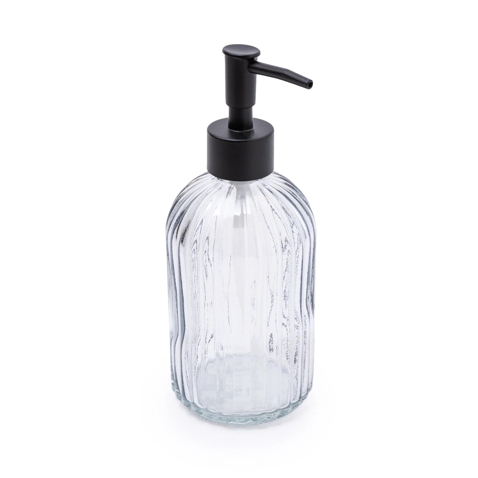 A pretty vintage style soap dispenser in a smoked glass, with a heavy ribbed glass body & a black finish pump action dispenser.