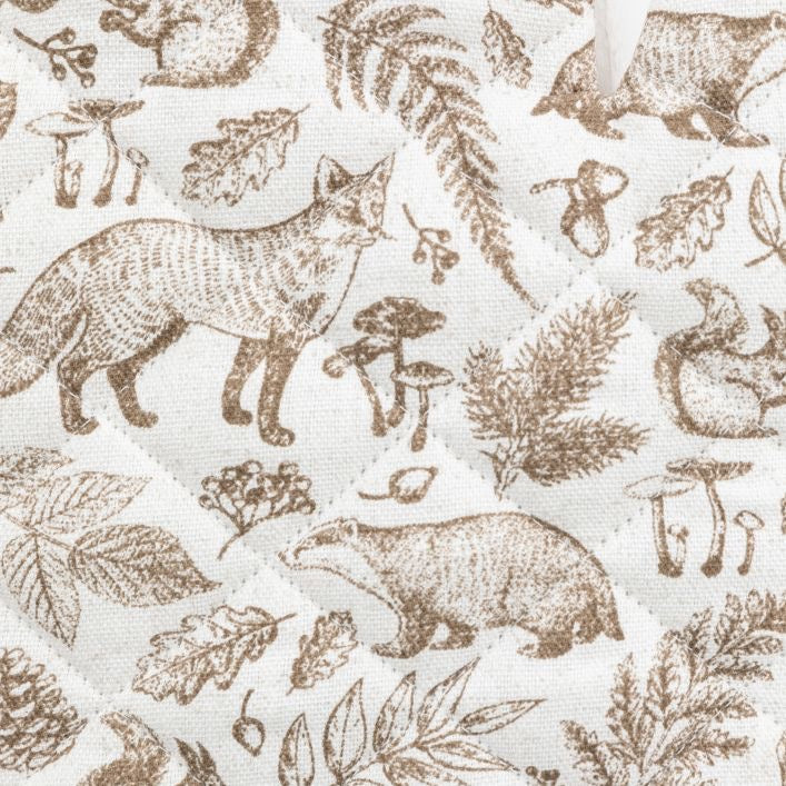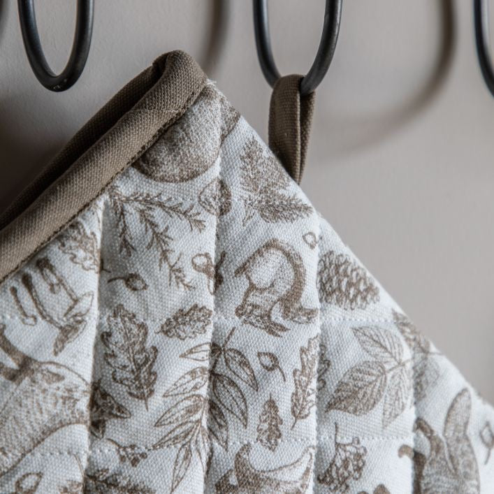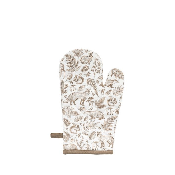 "Beautifully adored with a menagerie of woodland animals, flowers, fungi and plant life this oven mitt is practical and pretty. Made from 100% cotton and quilted to help withstand the heat the mitt also benefits from a easy to use hanging loop. Coordinating items are available to complete the set" - Jessica and Adam