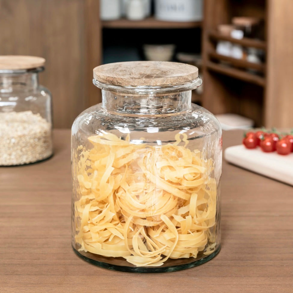 "Our Hawling Storage Jar is ideal for transforming your kitchen store cupboard. Made from gorgeous textured recycled glass and topped with a beautiful mango wood lid, it's made to match others in the range to complete your kitchen transformation. Its airtight seal means this medium version of the jar will happily keep lots of different food types fresh, from flour, rice, sugar and pasta to biscuits and other treats. It works well away from the kitchen, too - use it for pet food in the utility room or as storage in the bathroom for essentials like cotton wool and items of makeup" - Jessica and Adam