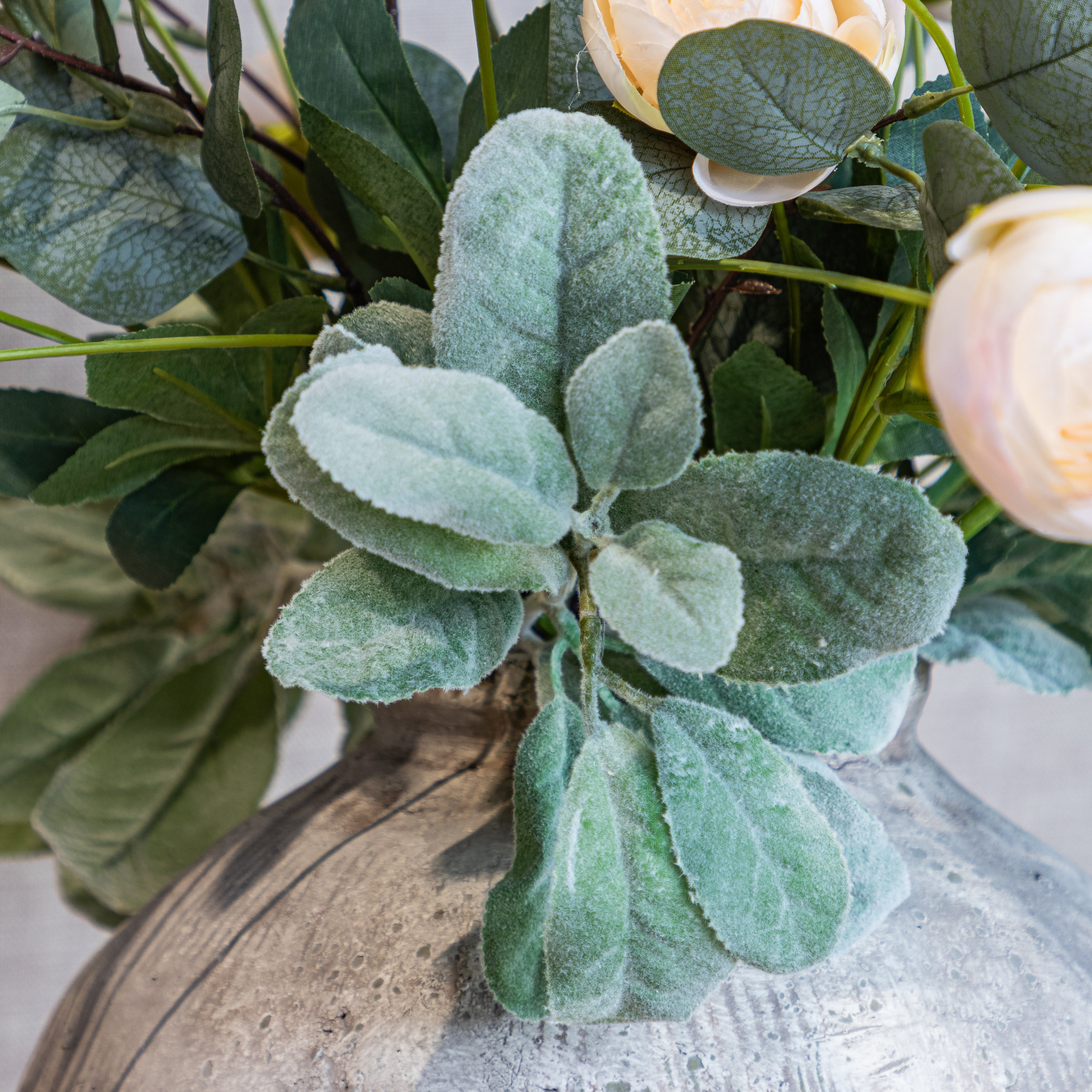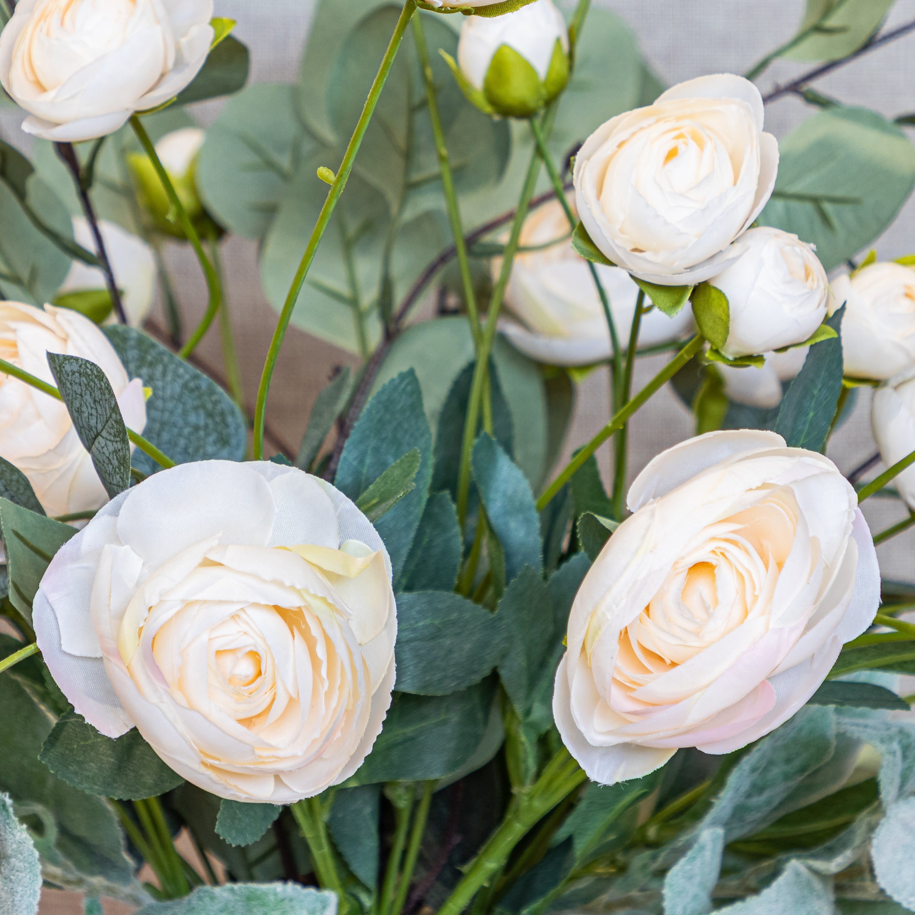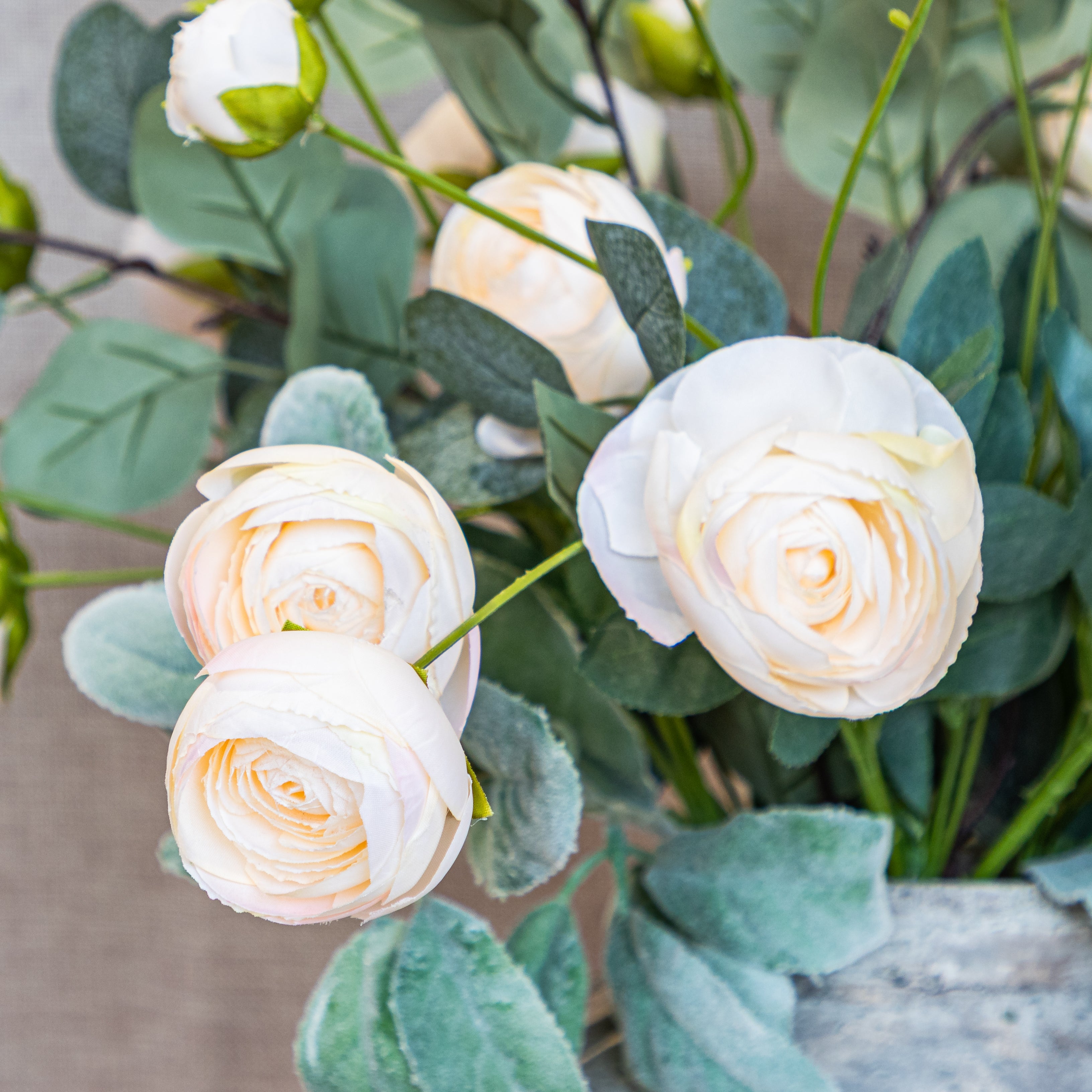 "Bring natural beauty into your home with this stunning faux flower arrangement featuring full-petaled ranunculus blooms, soft lambs ear foliage, and delicate dollar eucalyptus. The combination of textures and gentle colours creates an elegant display perfect for any room. Ideal as a gift or a treat for yourself, this arrangement brings a fresh, garden-inspired aesthetic to your space" - Jessica and Adam