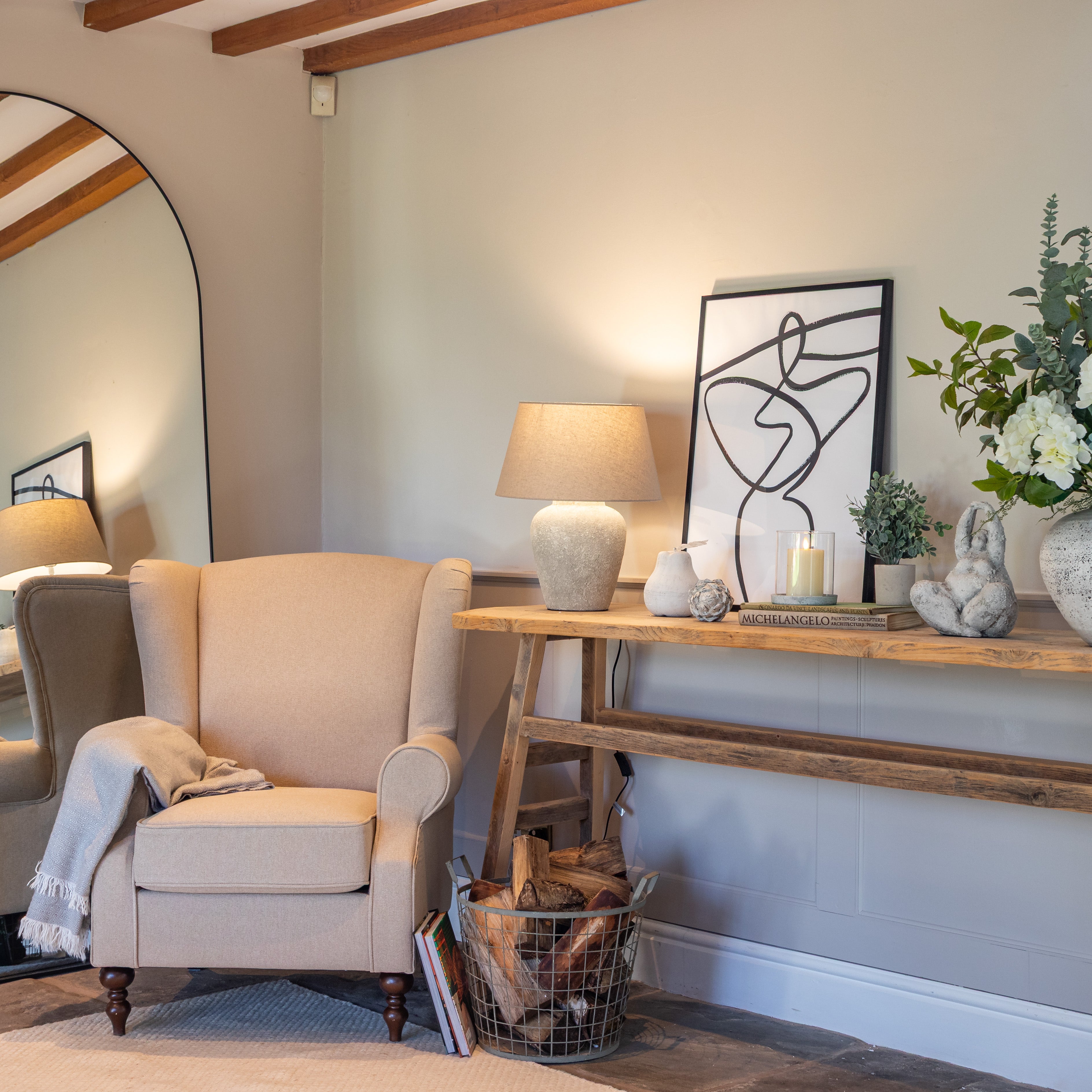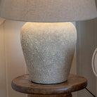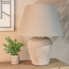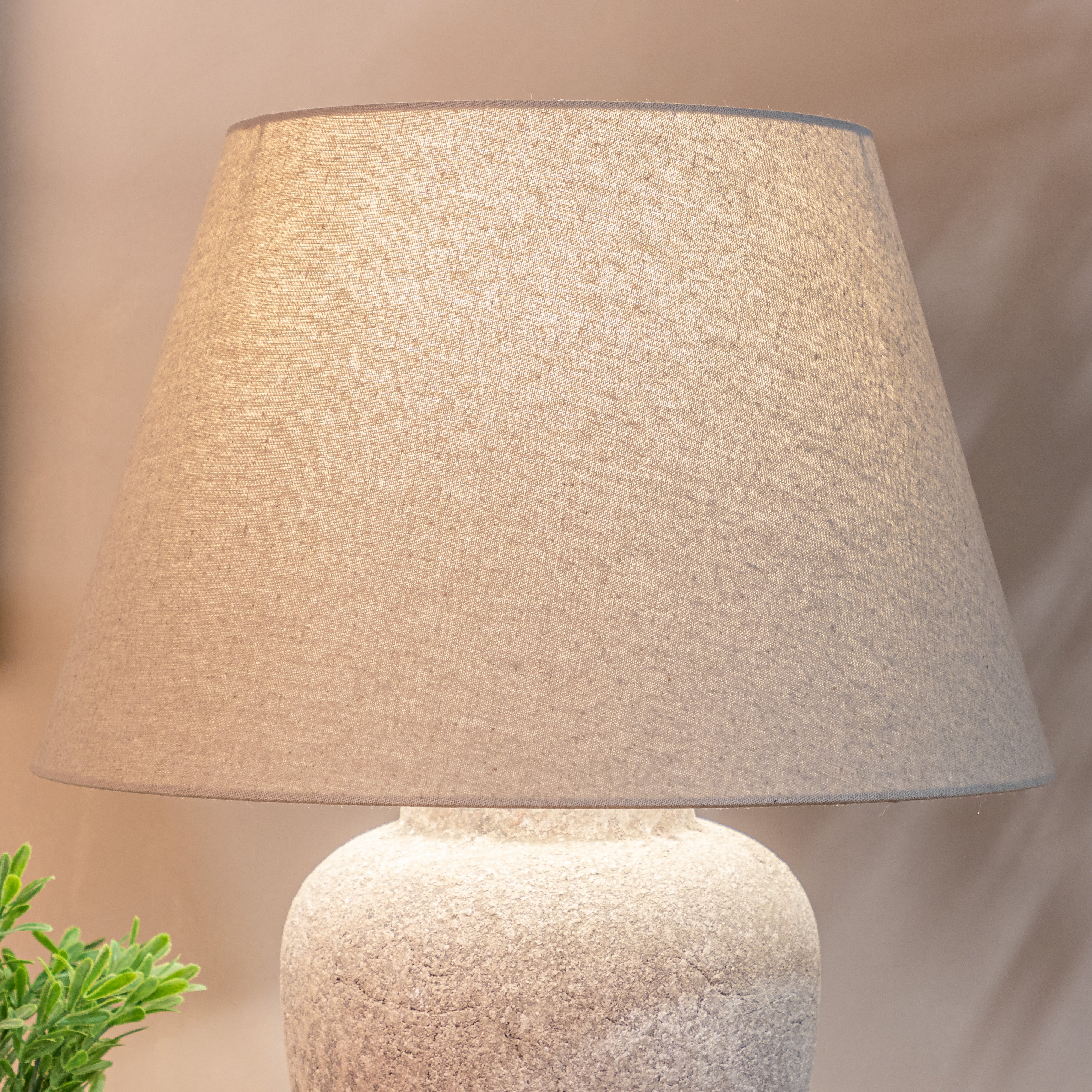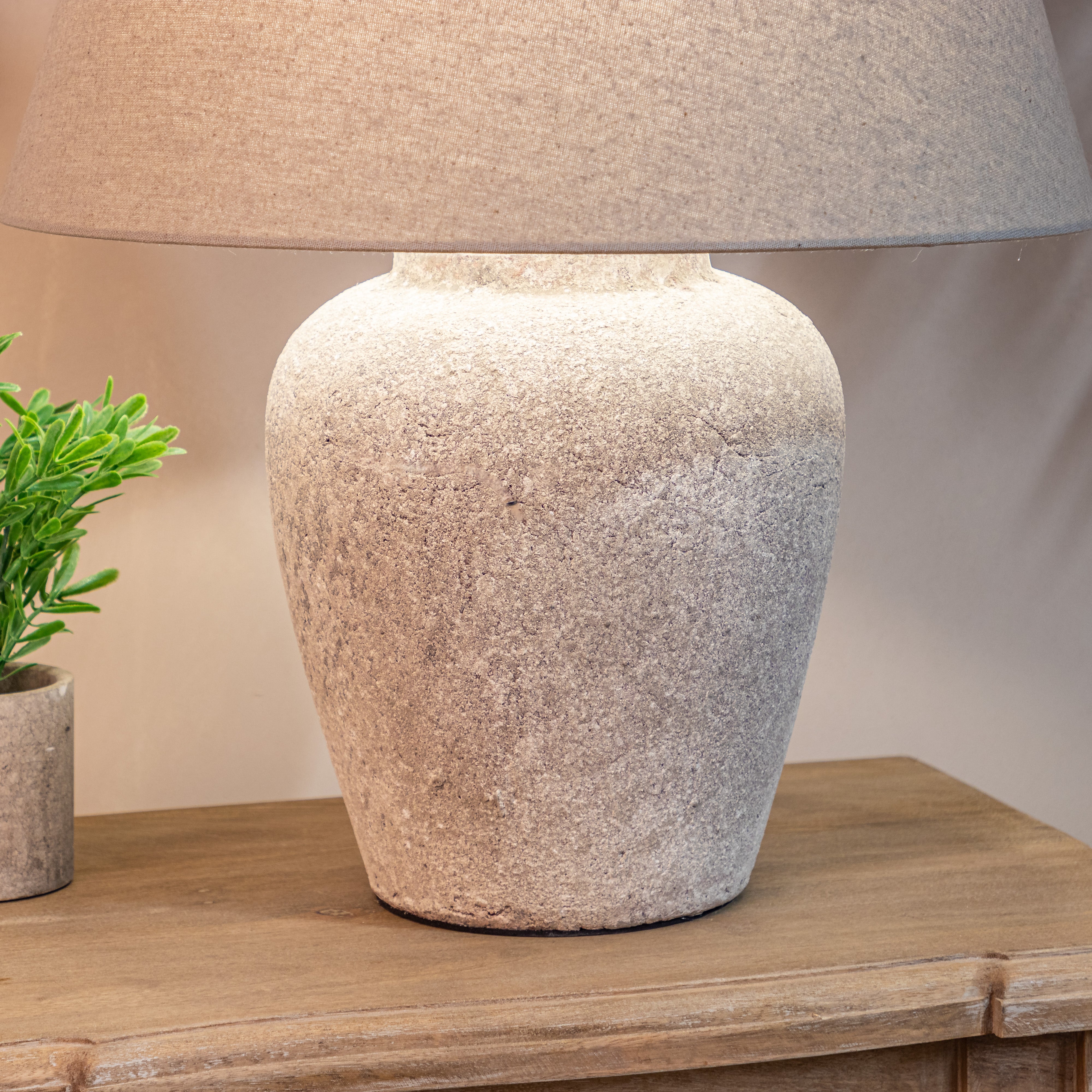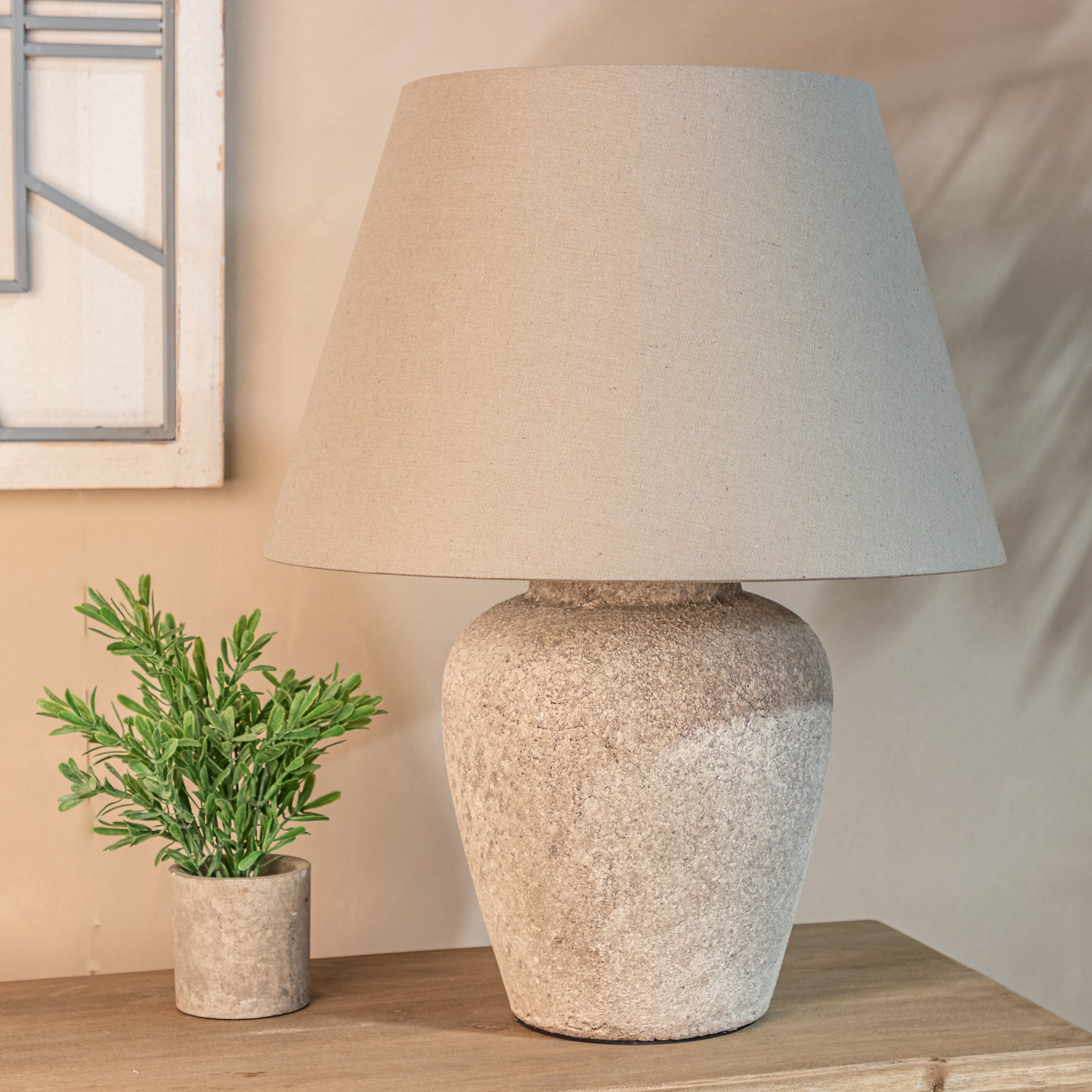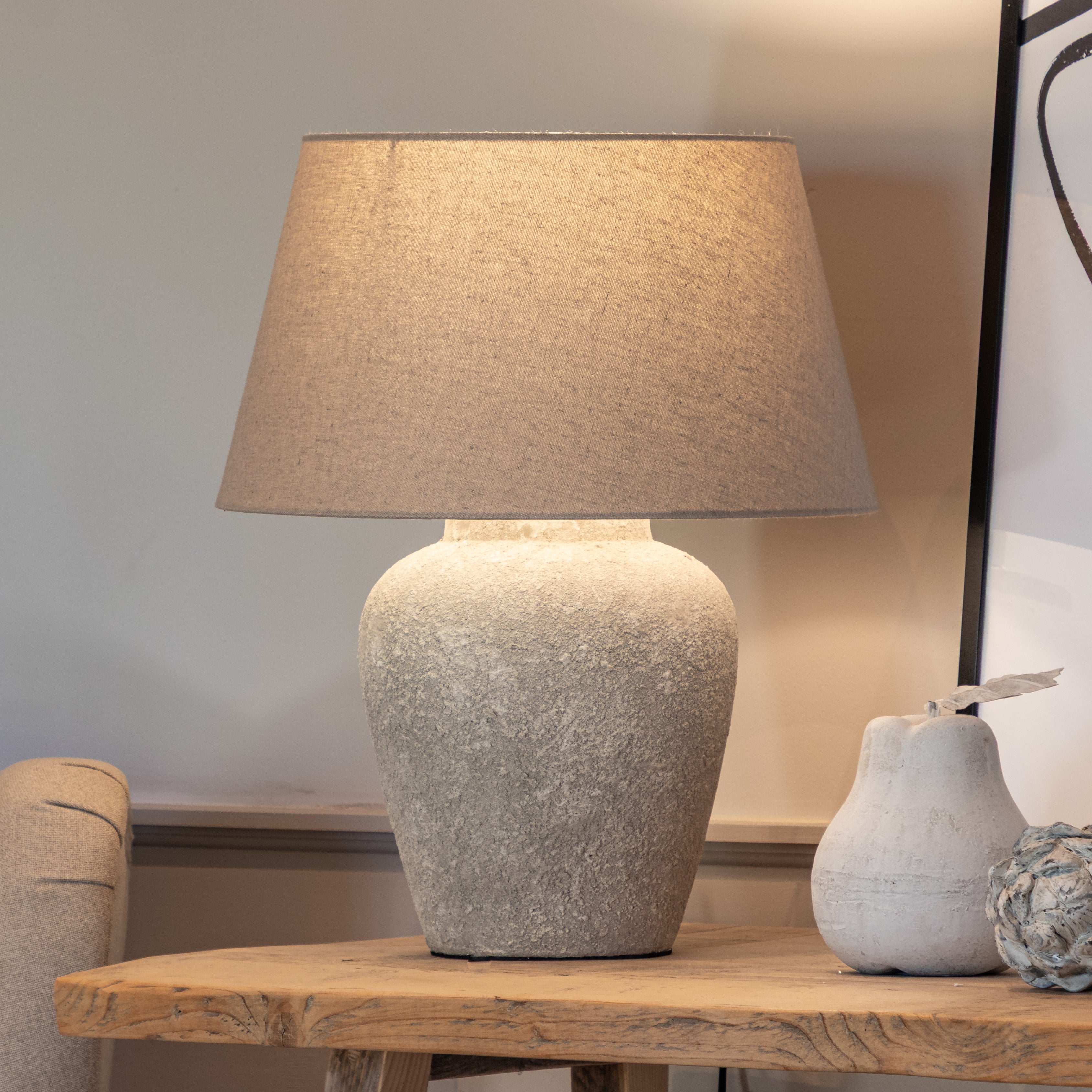 "This Rustic Textured Stone Style Table Lamp adds a touch of warmth and character to any room. Its textured, stone-style design exudes a cosy and inviting atmosphere. Handcrafted, this lamp is a perfect combination of rustic charm and modern style and comes complete with Taupe Linen Shade" - Jessica and Adam