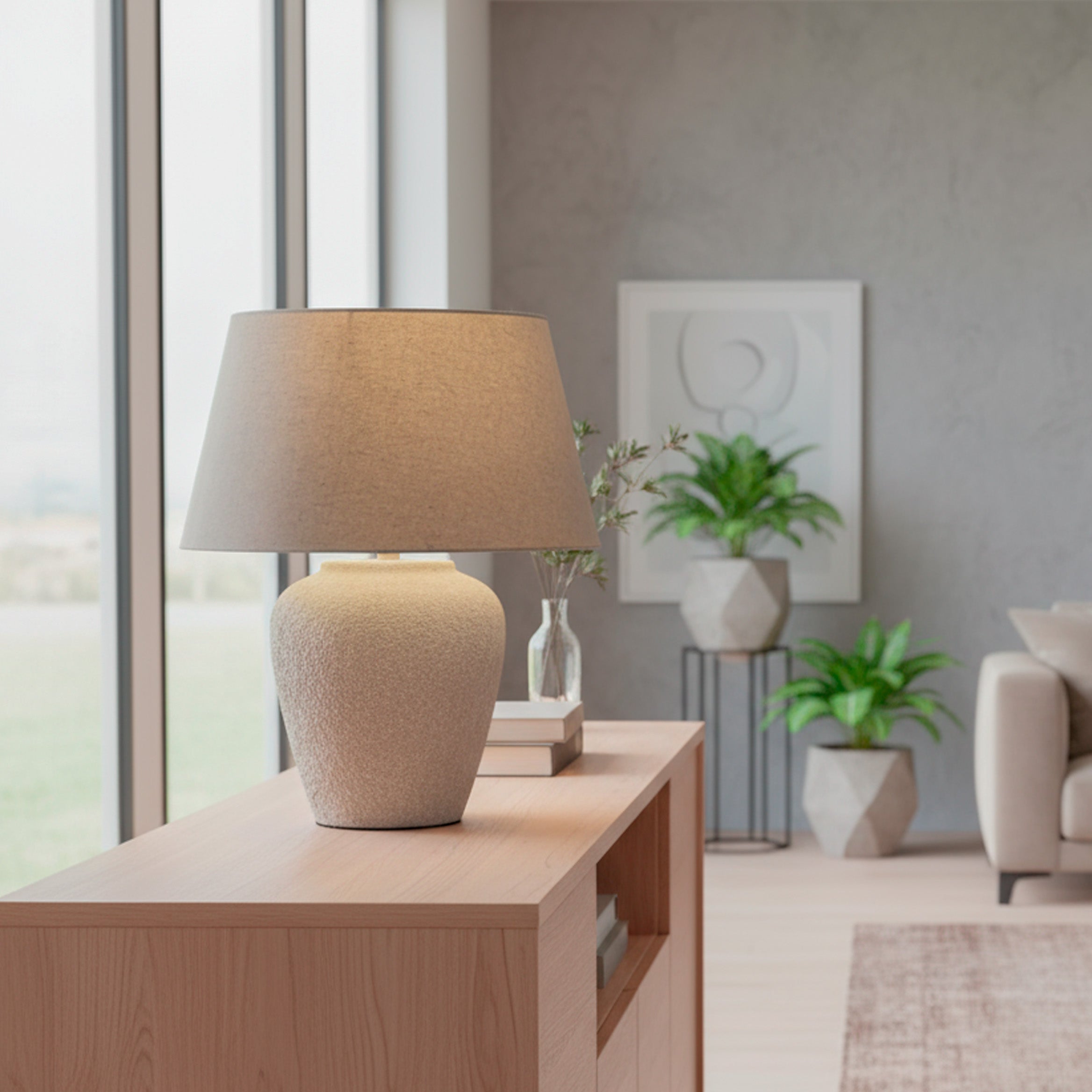 "This Rustic Textured Stone Style Table Lamp adds a touch of warmth and character to any room. Its textured, stone-style design exudes a cosy and inviting atmosphere. Handcrafted, this lamp is a perfect combination of rustic charm and modern style and comes complete with Taupe Linen Shade" - Jessica and Adam