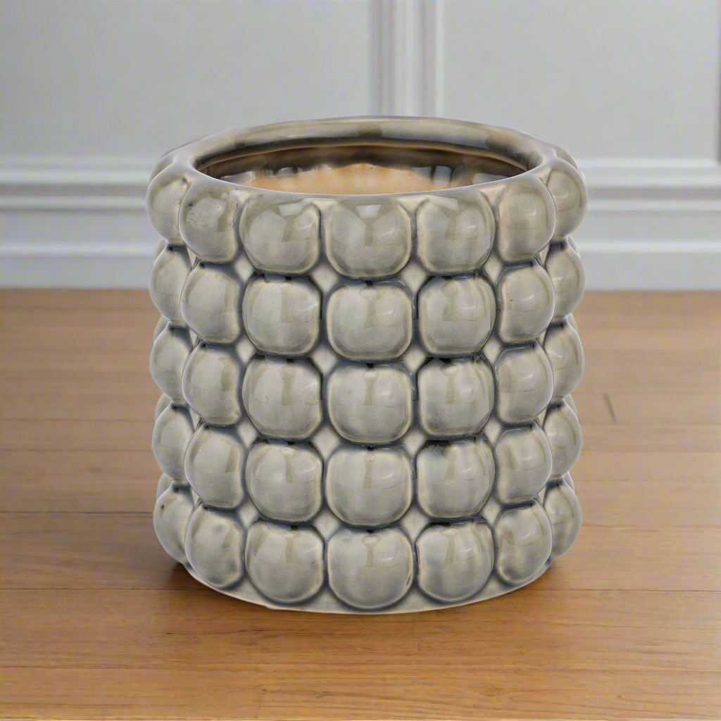 Handcrafted in ceramic, this planter's bold and distinctive all-over bubble texture is glazed a versatile grey colour that will set your choice of plant off to perfection.