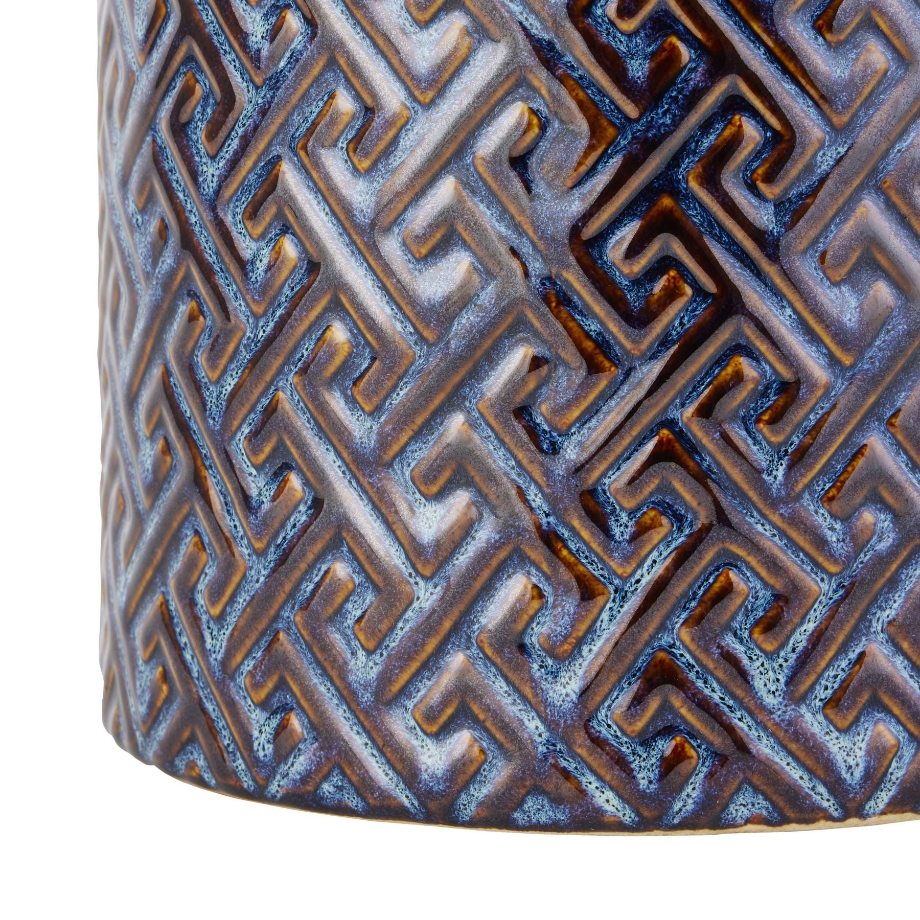 "Handcrafted in ceramic, this Seville Collection Large Indigo Marrakesh Urn is a stylish and contemporary jar with removable lid. The bold and distinctive raised pattern that wraps itself around the barrel of this opulent jar is glazed a versatile Indigo tone. This striking jar would look elegant styled on its own or fabulous displayed as a pair with the smaller sized version" - Jessica and Adam