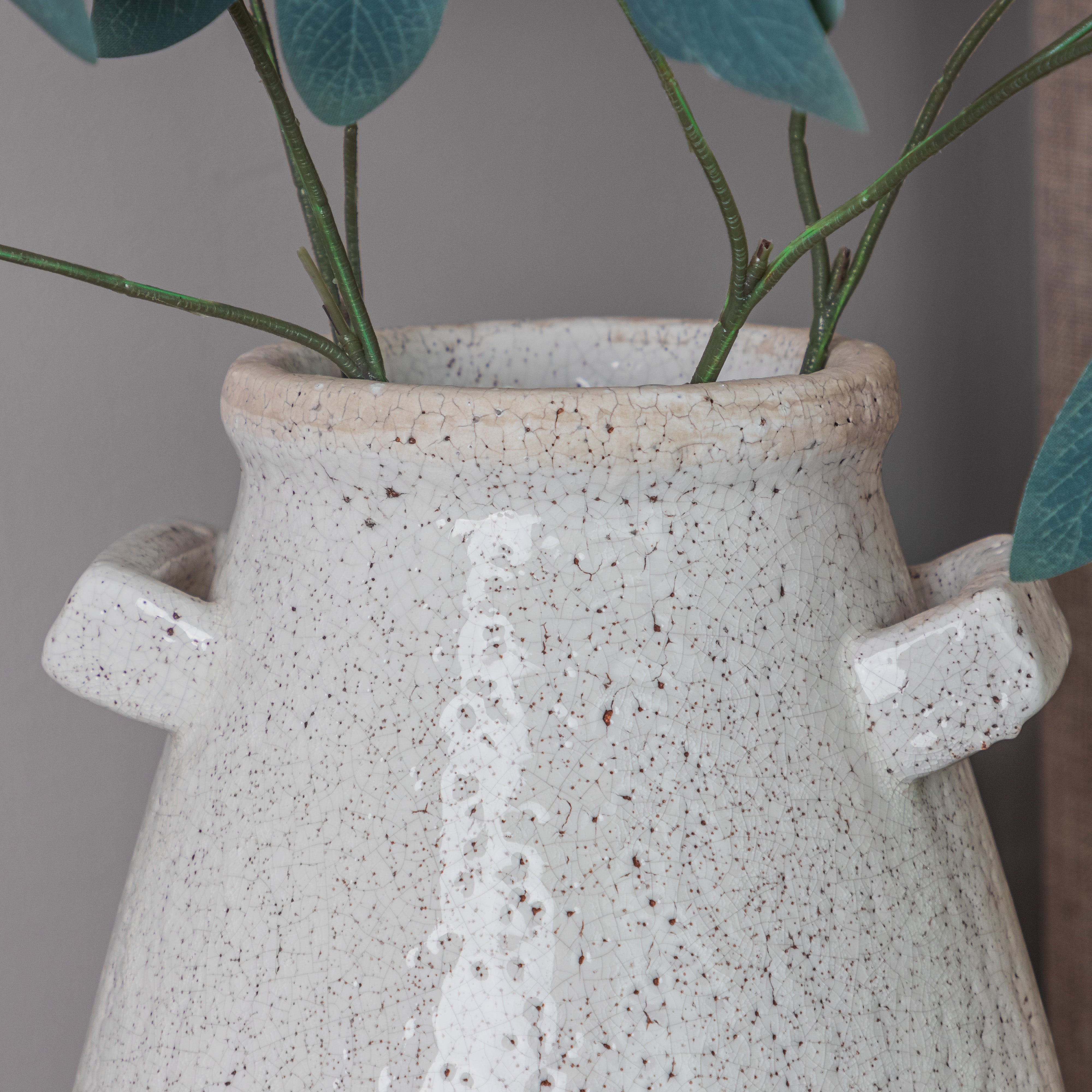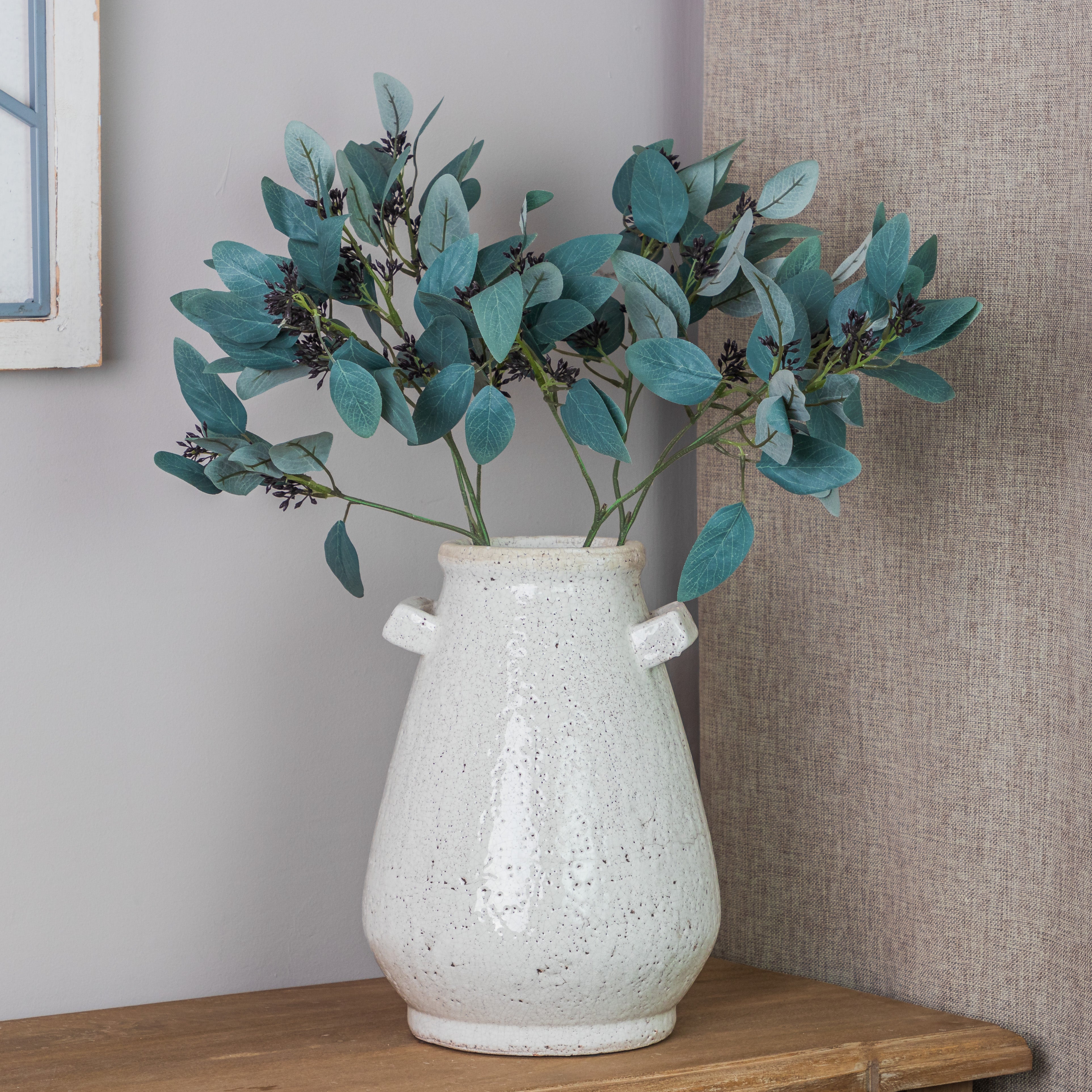 "This Small White Terracotta Vase with Handles has a classic but modern look. It's design is suitable for both traditional and modern interior spaces. Its white glazed terracotta material makes it perfect for any room, while its handles add an extra touch of style" - Jessica and Adam