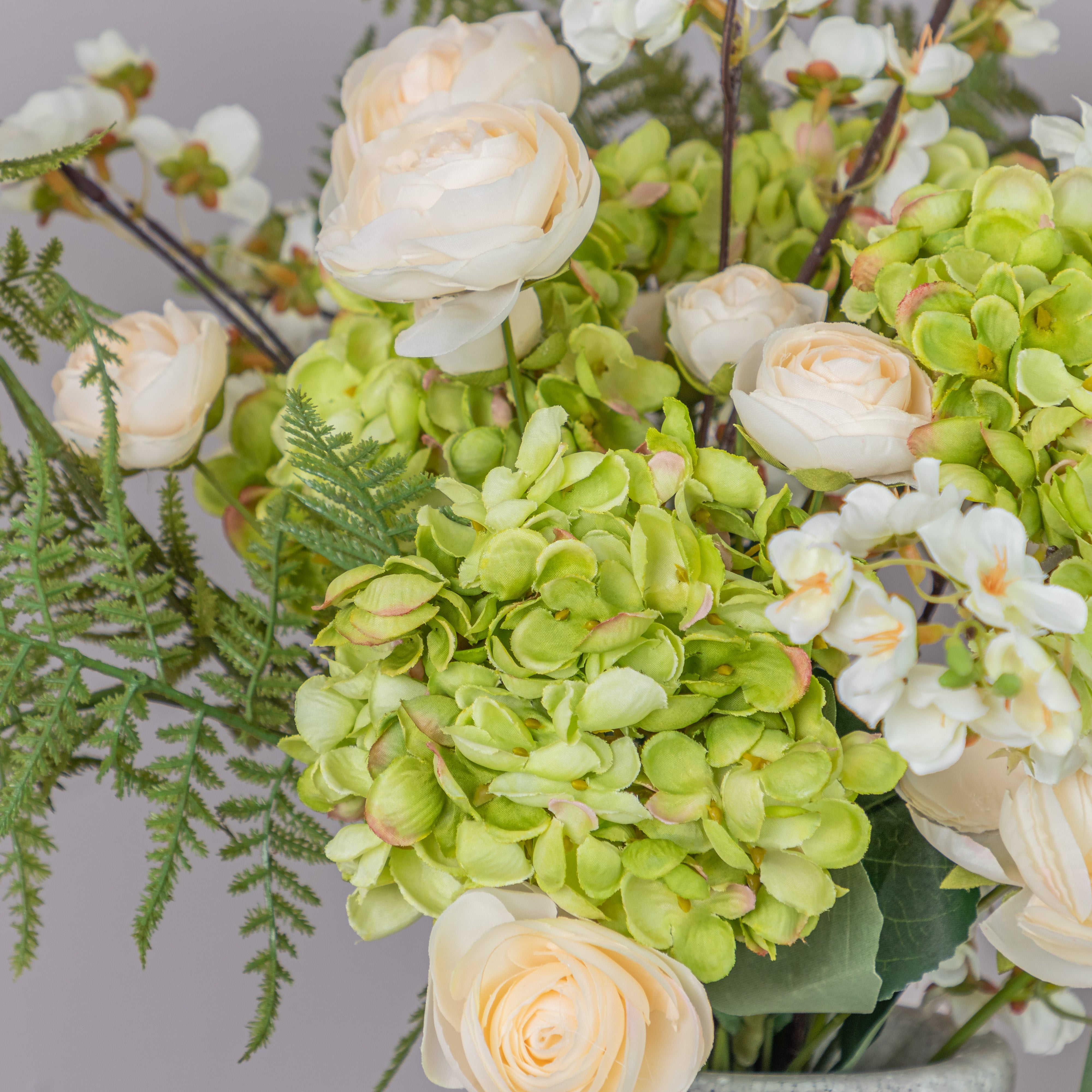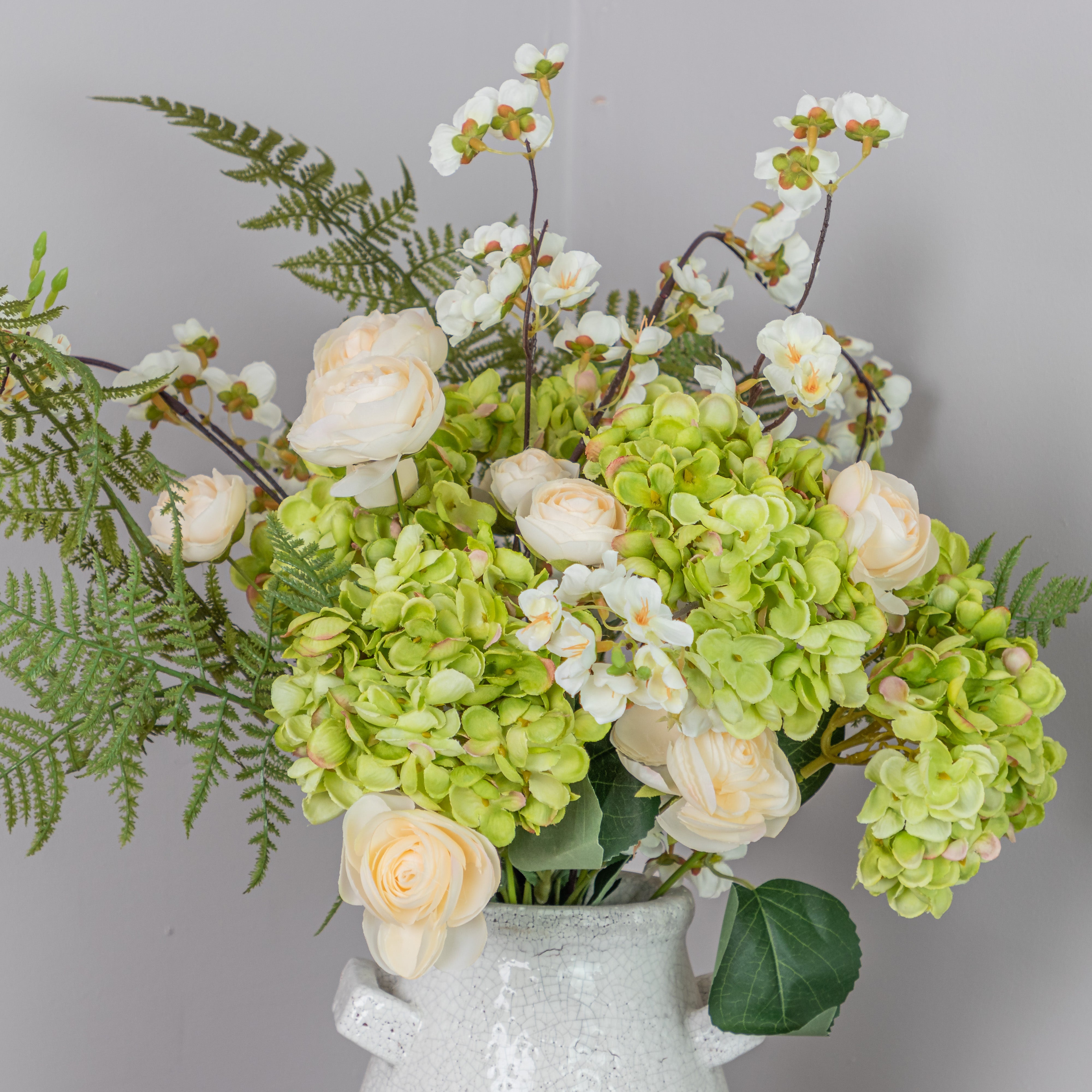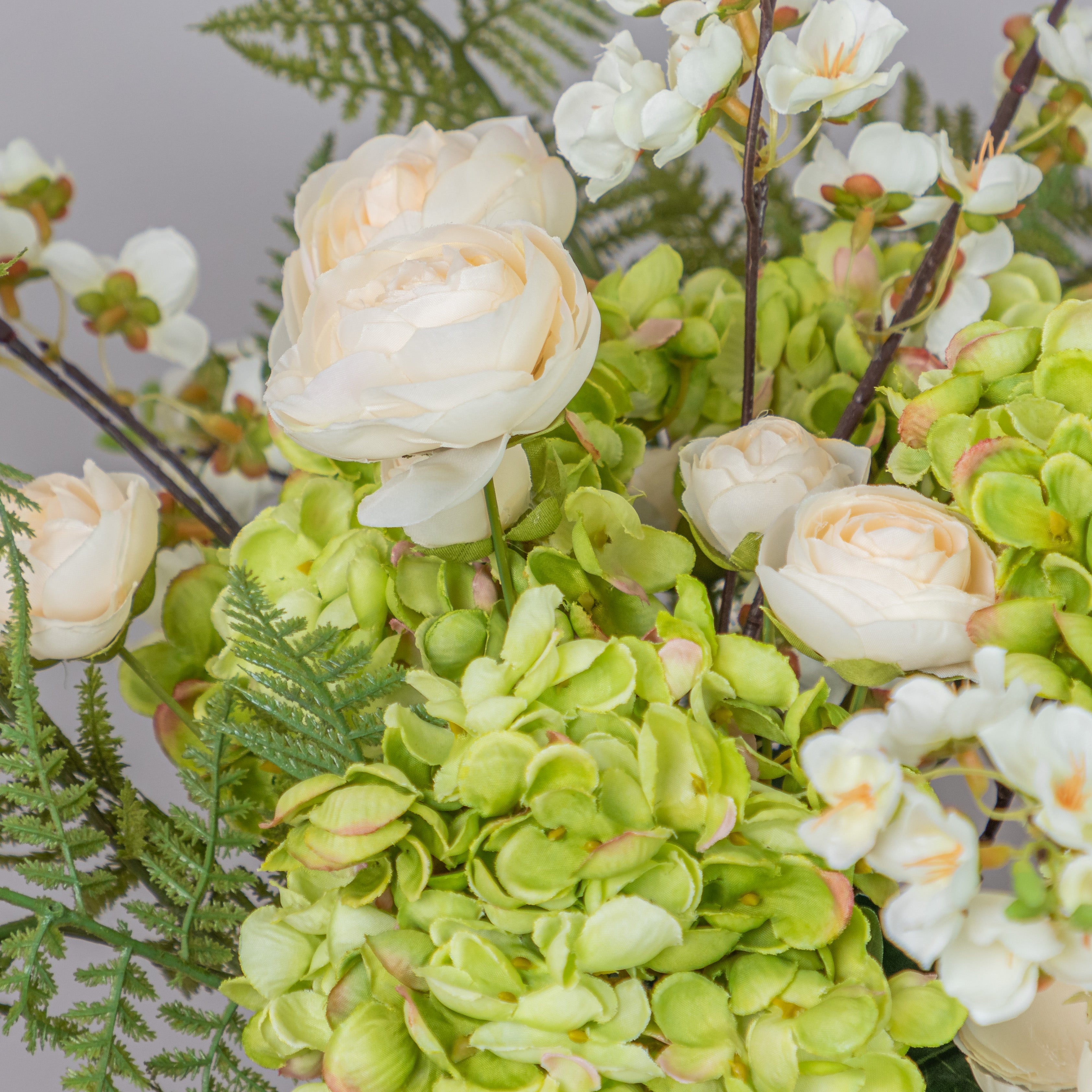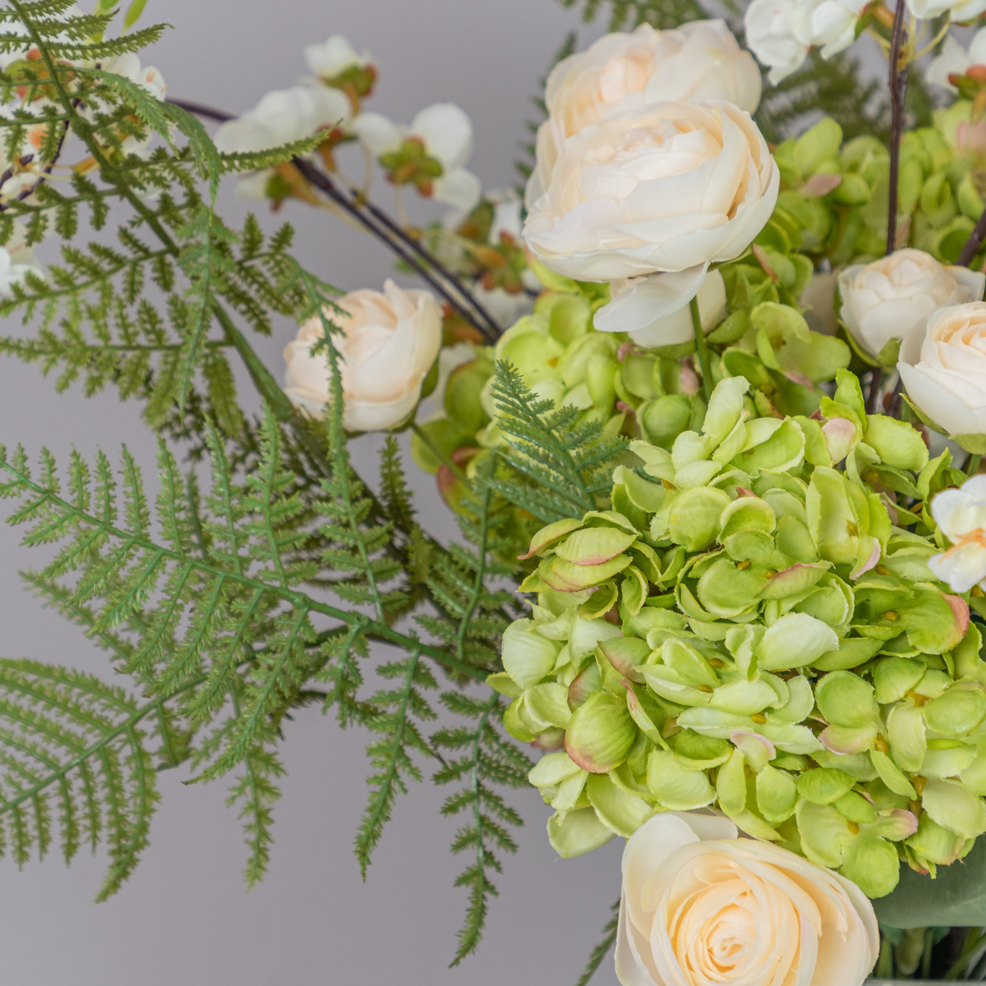 "Enhance your space with our stunning Spring Mix Bouquet. This arrangement includes a beautiful combination of Green Hydrangea, Japanese Bloom, and Cream Ranunculus creating a vibrant and elegant look. Experience the freshness of spring all year round" - Jessica and Adam