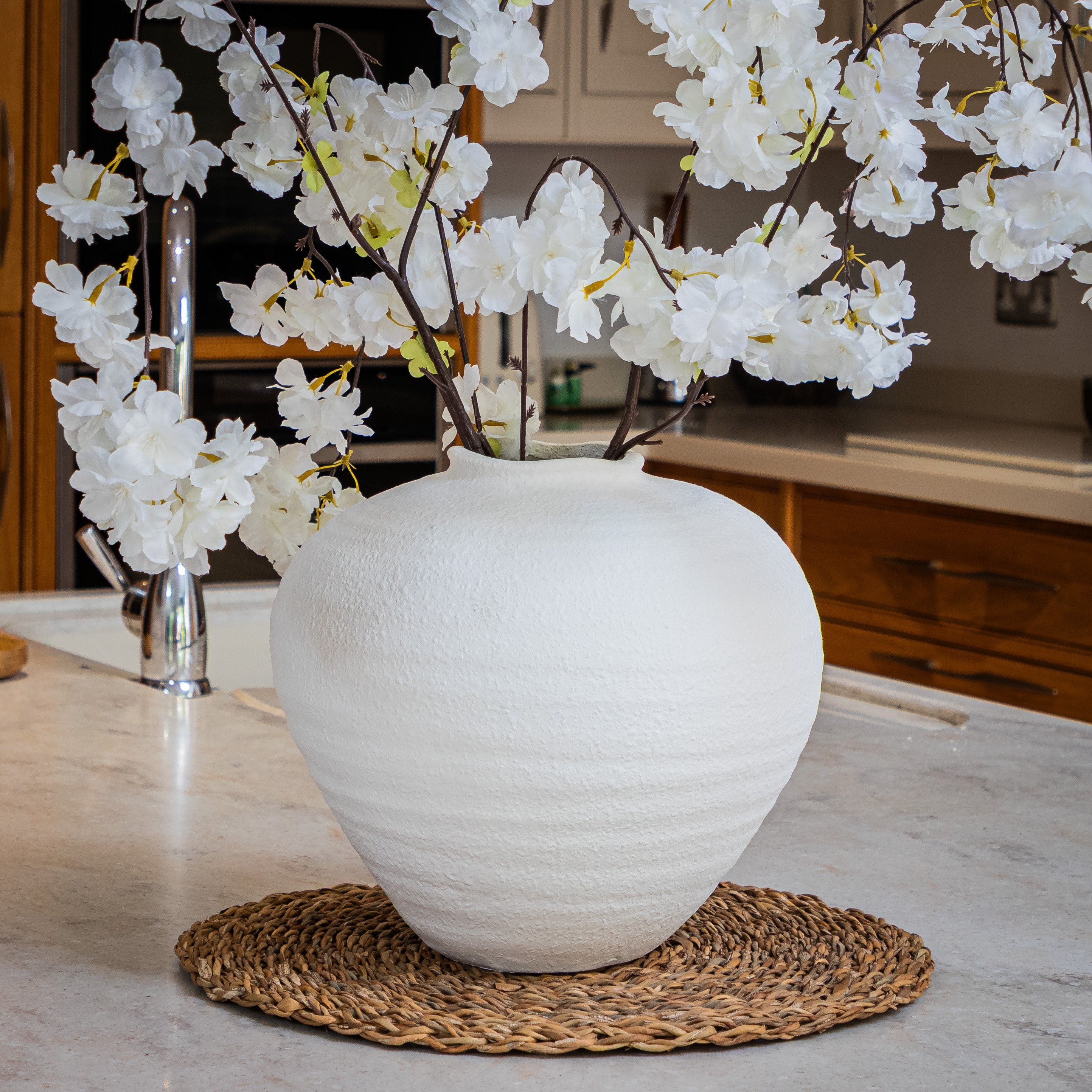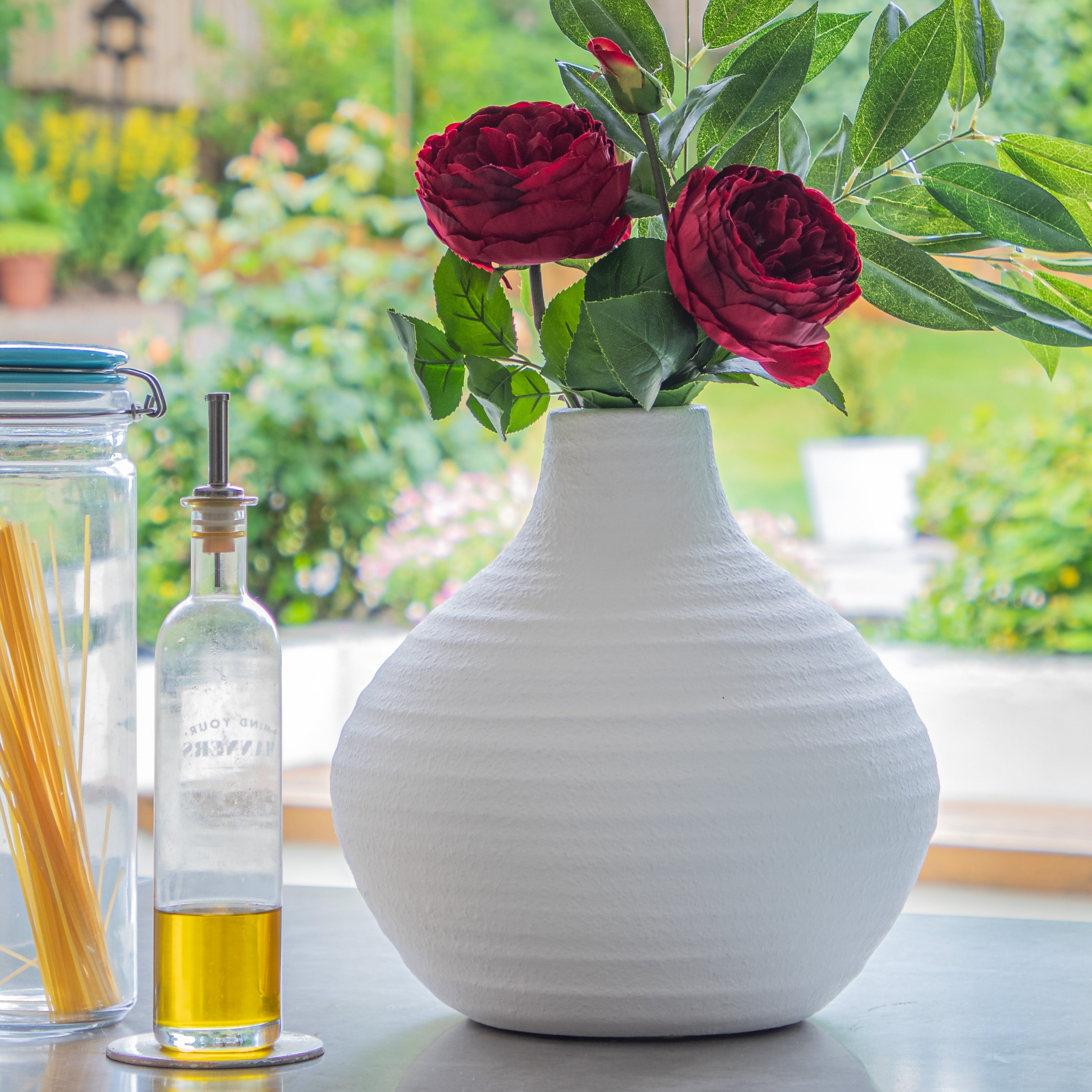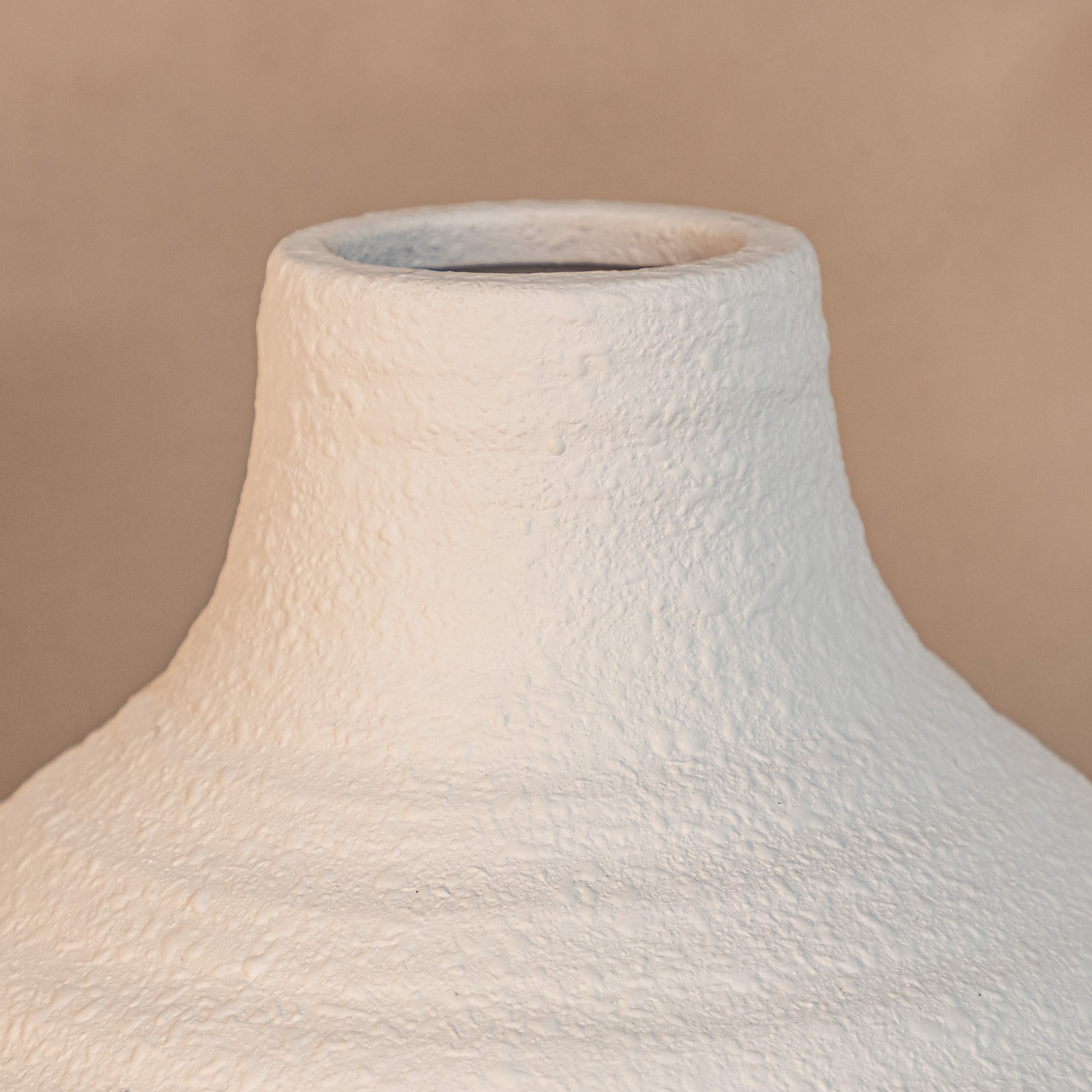 "This textured matt white ceramic vase is both modern and rustic. Crafted from high-quality ceramic for a neutral look and feel. The unique shape and texture of this vase will upgrade any room. It is the perfect addition to any home" - Jessica and Adam